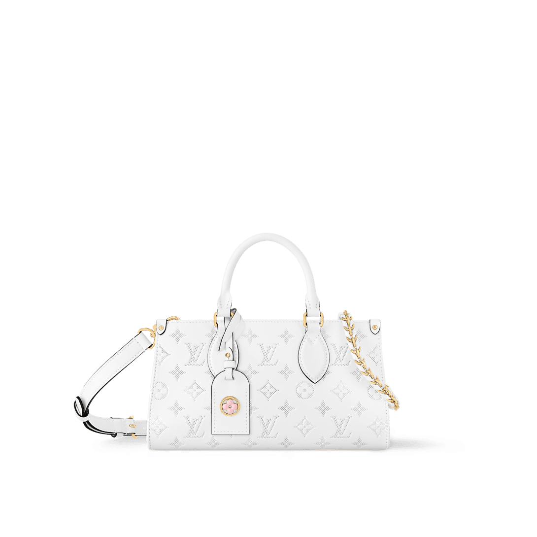 With its beautifully elongated silhouette, the OnTheGo East West handbag is made from calfskin with the Monogram pattern produced with a perforation trompe l’oeil embossing technique. The bag features light-gold-color hardware and a removable name tag, adorned with a Monogram Flower detail inspired by ready-to-wear.
