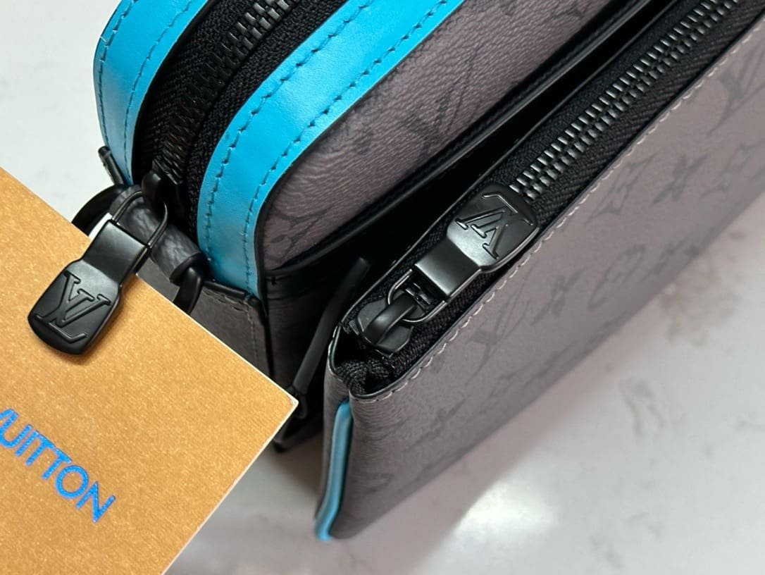 Fashioned from Monogram Eclipse Reverse canvas with turquoise highlights, the Trio Messenger bag is three bags in one. In additional to the main pouch, there’s a detachable zipped pocket on the front, and removable coin purse attached to the strap. An adjustable and removable textile strap, signed Louis Vuitton, enables comfortable shoulder carry.
