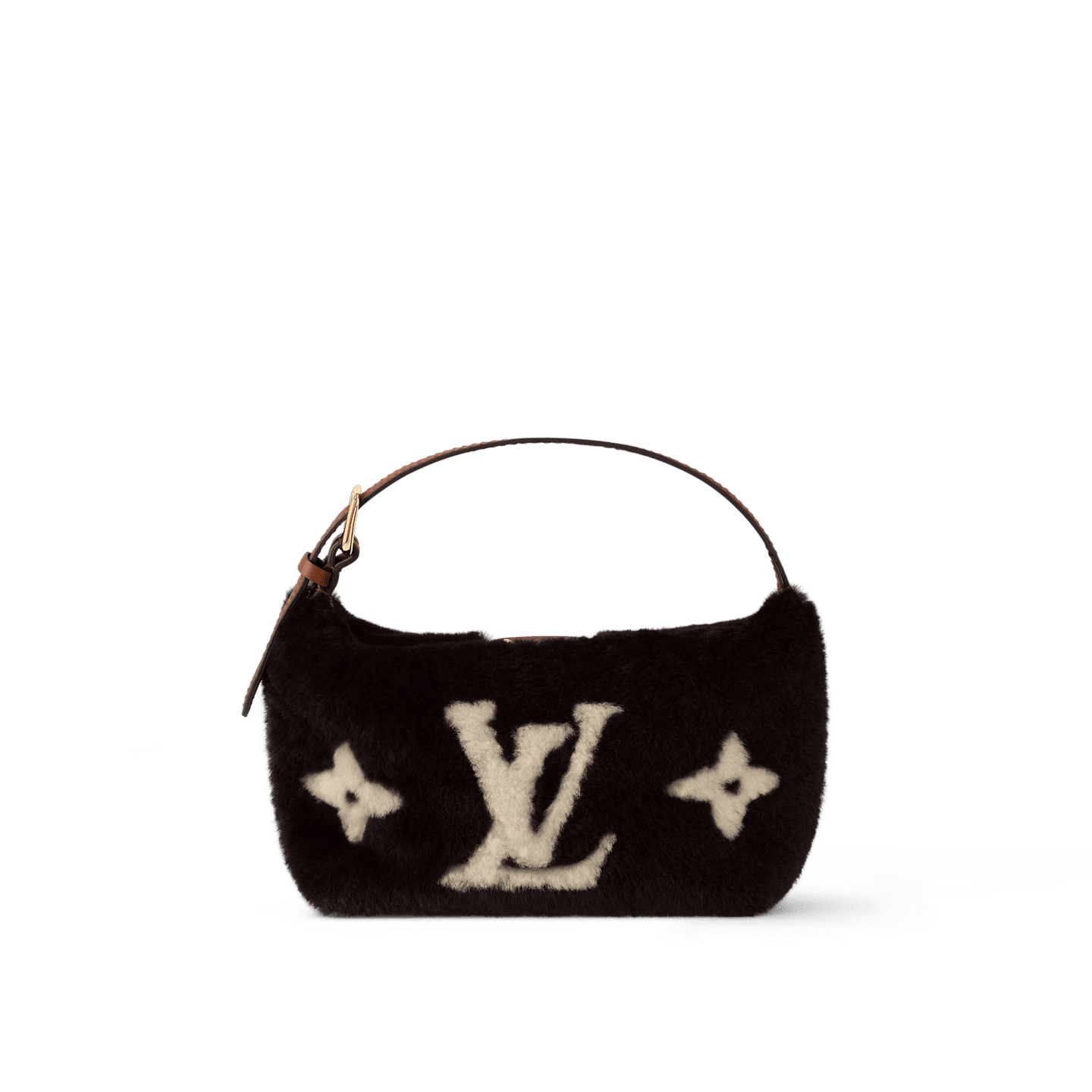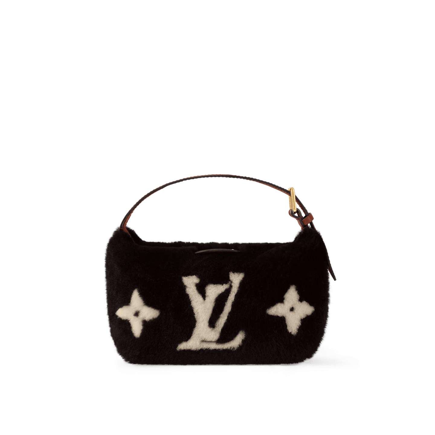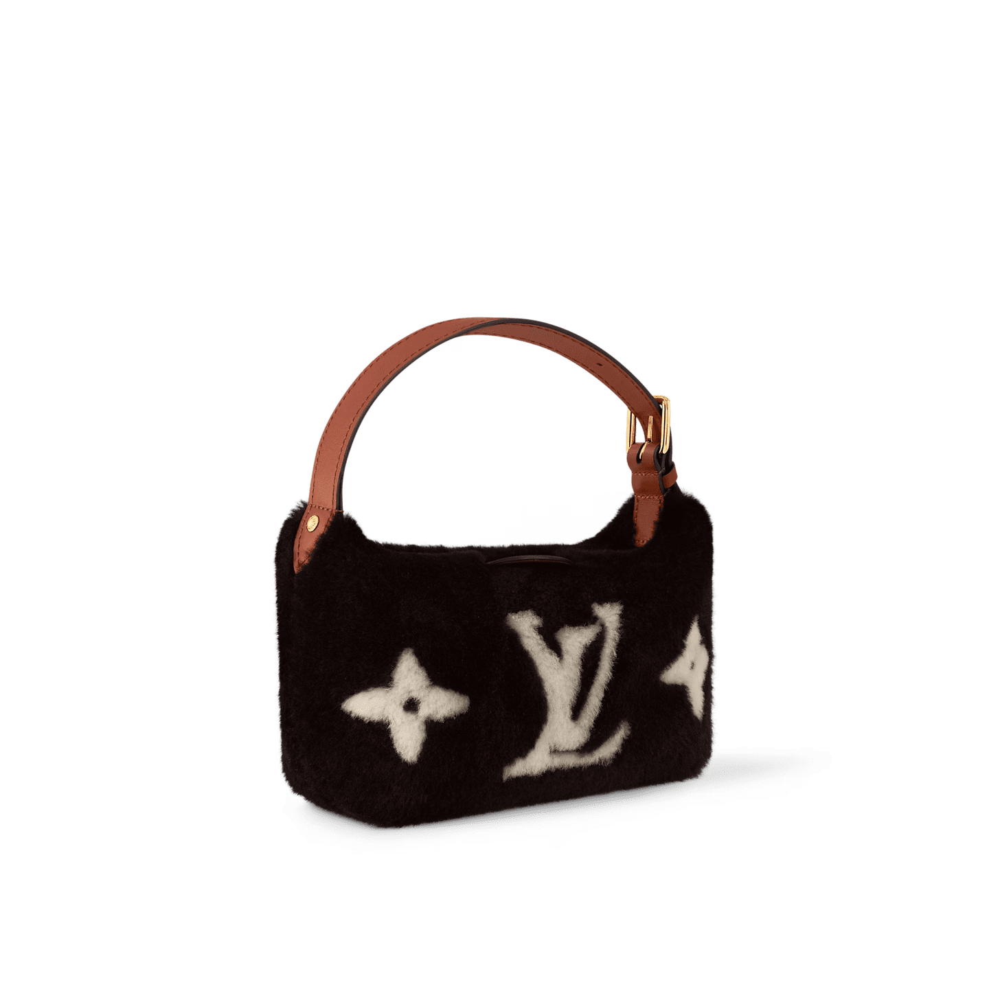Playful yet sophisticated, the Pochette Hills bag is part of the LV Ski collection, making it a perfect choice for the slopes and beyond. Accented with gold-toned hardware, it is crafted from shearling in a rich chocolate hue contrasted with the signature Monogram pattern in cream. Wear it nestled over the shoulder or carry it by hand.