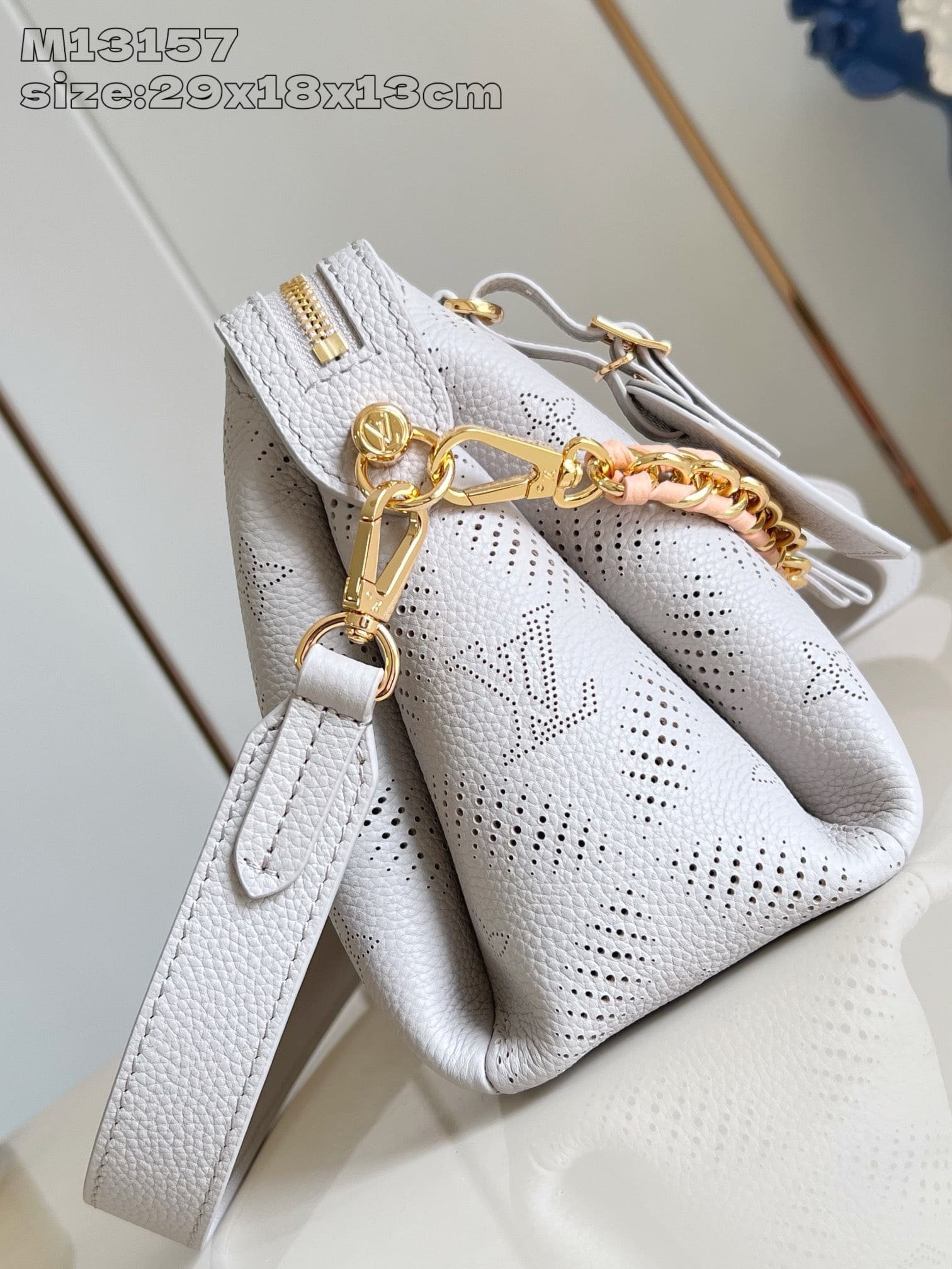 This Hand It All PM showcases the House’s new Bloom signature, a reinvention of the perforated Mahina Monogram with a floral twist. Crafted from calfskin, it is elevated with a braided chain and comes with a signature name tag in a contrasting shade. Inside, there is a flat pocket to store a phone and it can be worn multiple ways, including cross-body and on the shoulder.