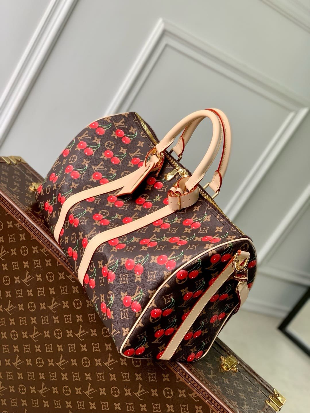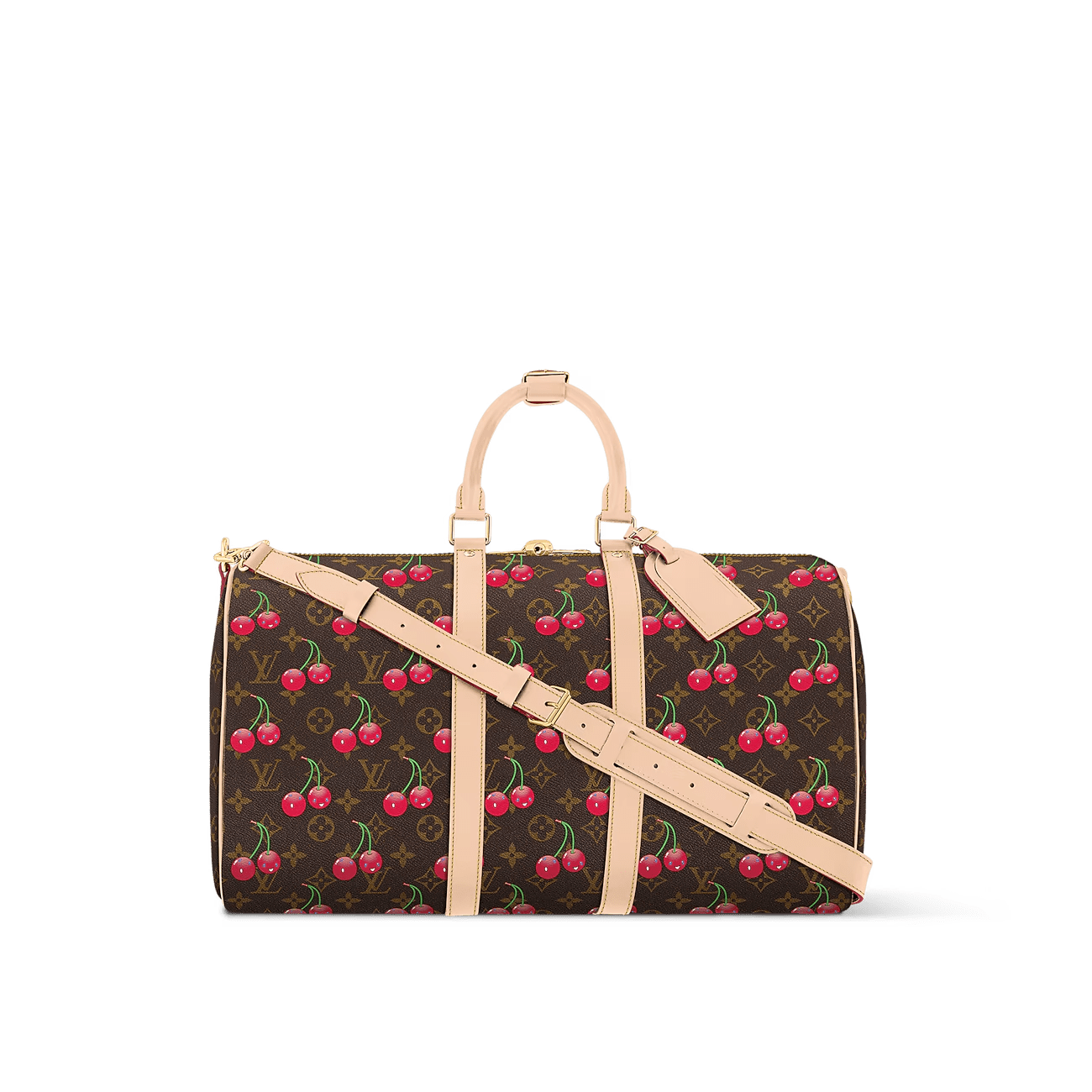 The iconic Keepall Bandoulière 45 is playfully revisited as part of the re-edition of the Louis Vuitton x Takashi Murakami collection. The House’s classic Monogram canvas is scattered with luscious cherry motifs in the renowned Japanese artist’s colorful aesthetic, which is complemented by a bold red lining. The emblematic lateral bands, top handles and adjustable strap are highlighted in elegant natural leather, while golden hardware completes the look.