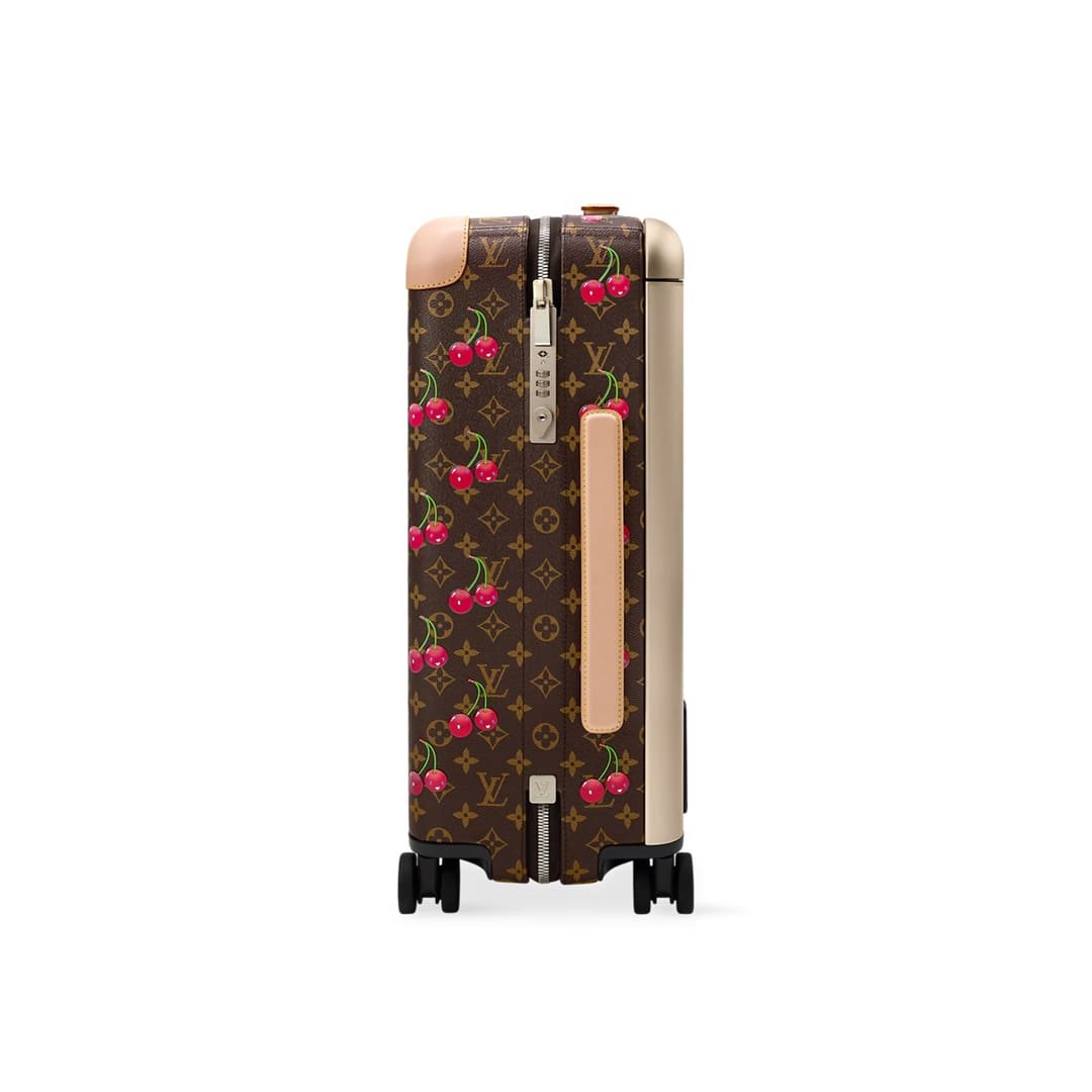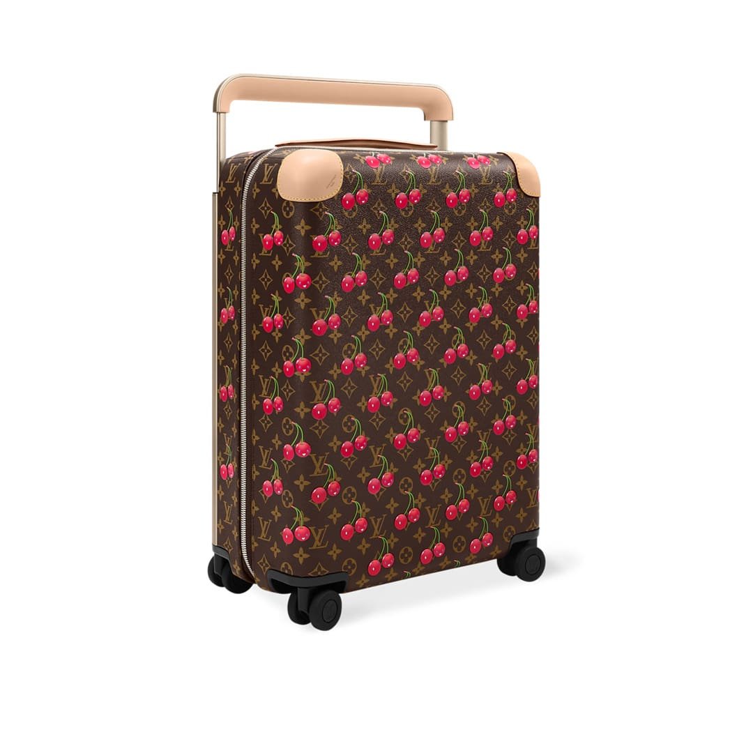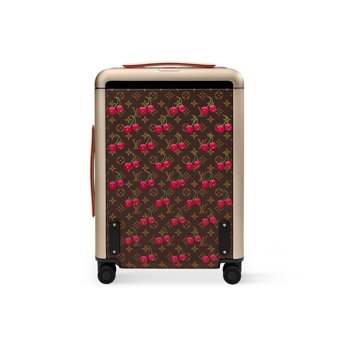 The Horizon 55 suitcase pays tribute to the House’s travel heritage in a sleek cabin-sized four-wheel design complete with a large external cane and TSA combination locks. As part of the celebratory second edition of the cross-category Louis Vuitton x Takashi Murakami collection, the iconic Monogram canvas case is playfully layered with kawaii cherry motifs, whose vibrant shade is echoed inside by the red lining and elastic straps.