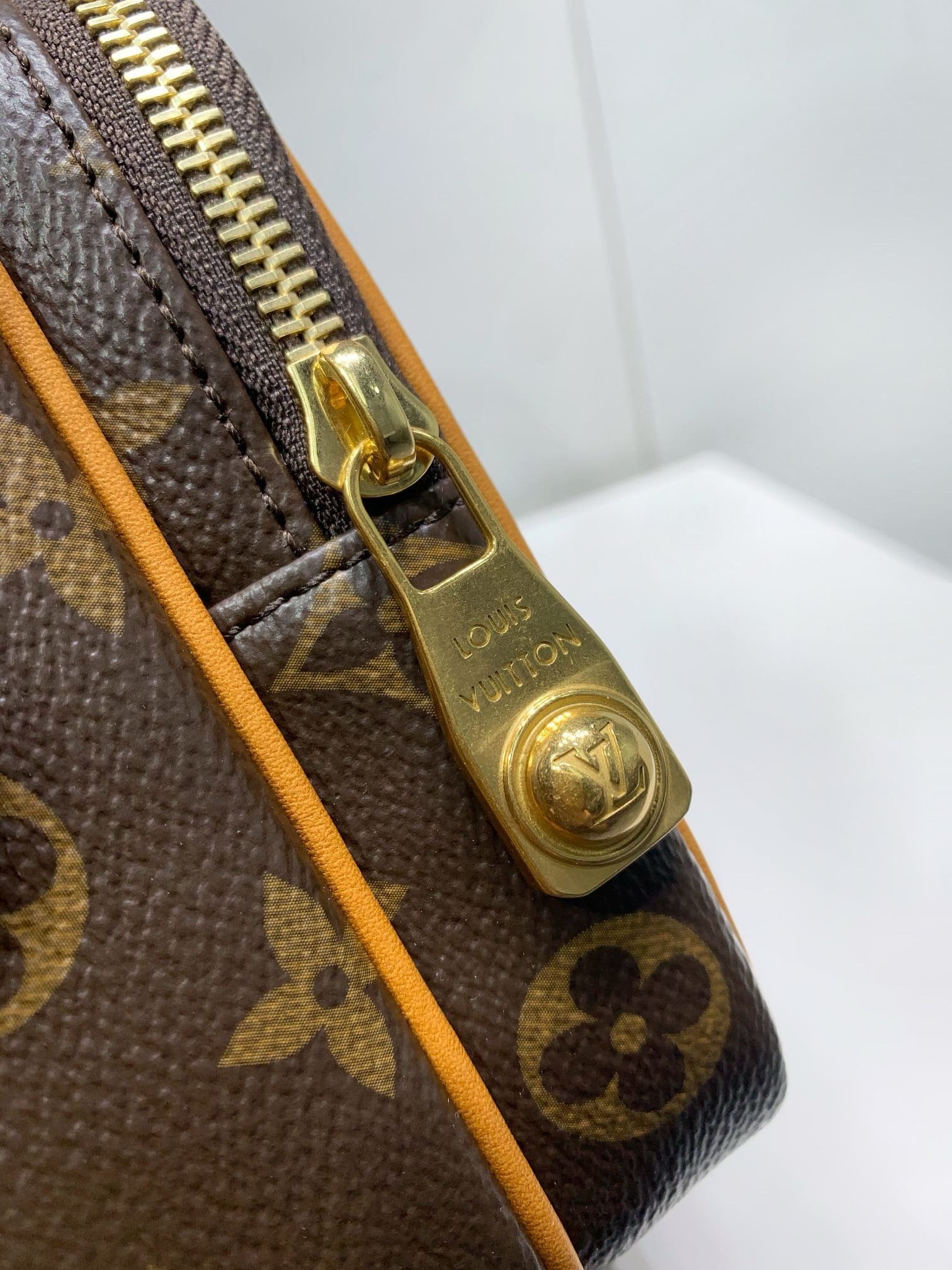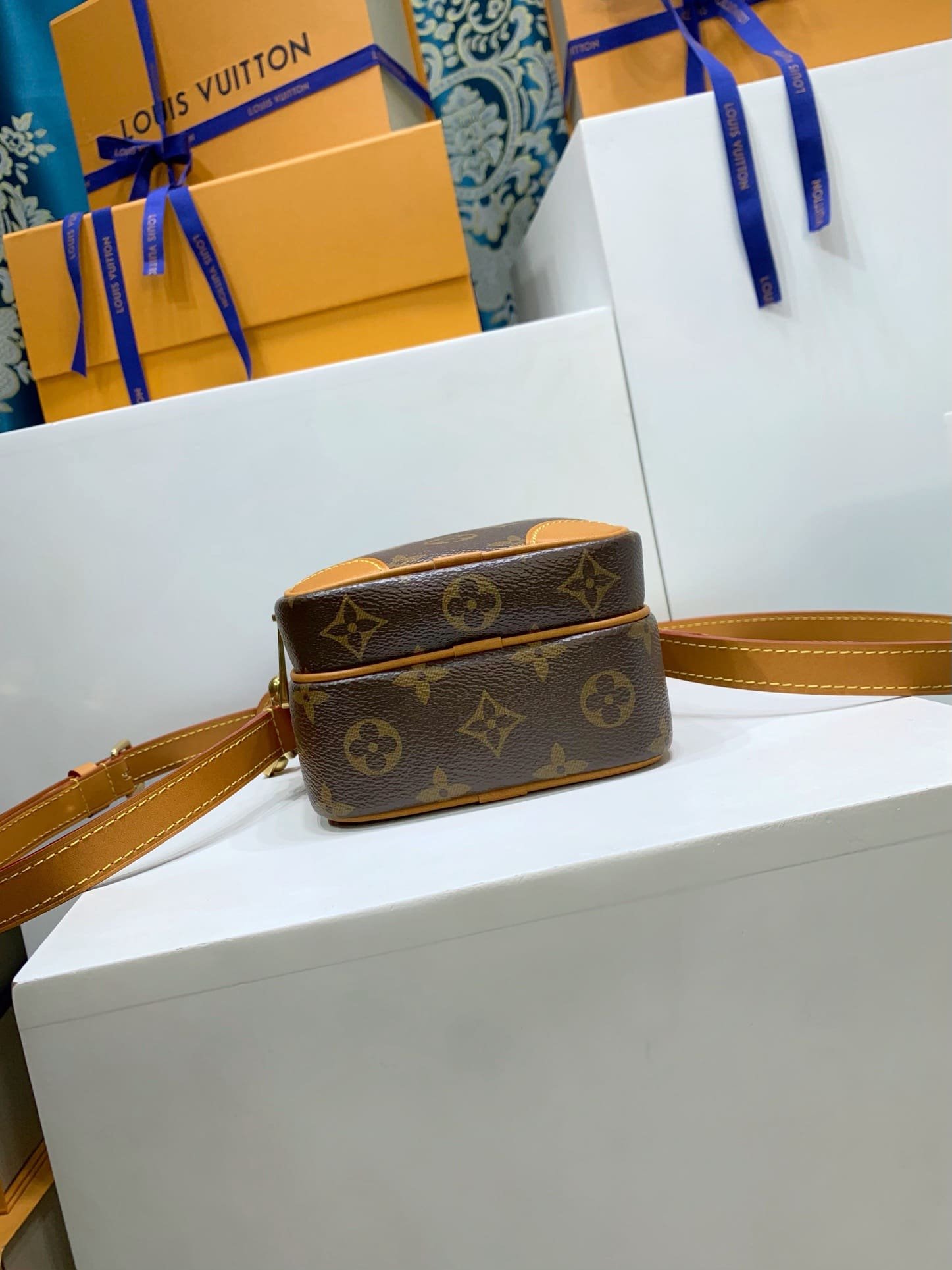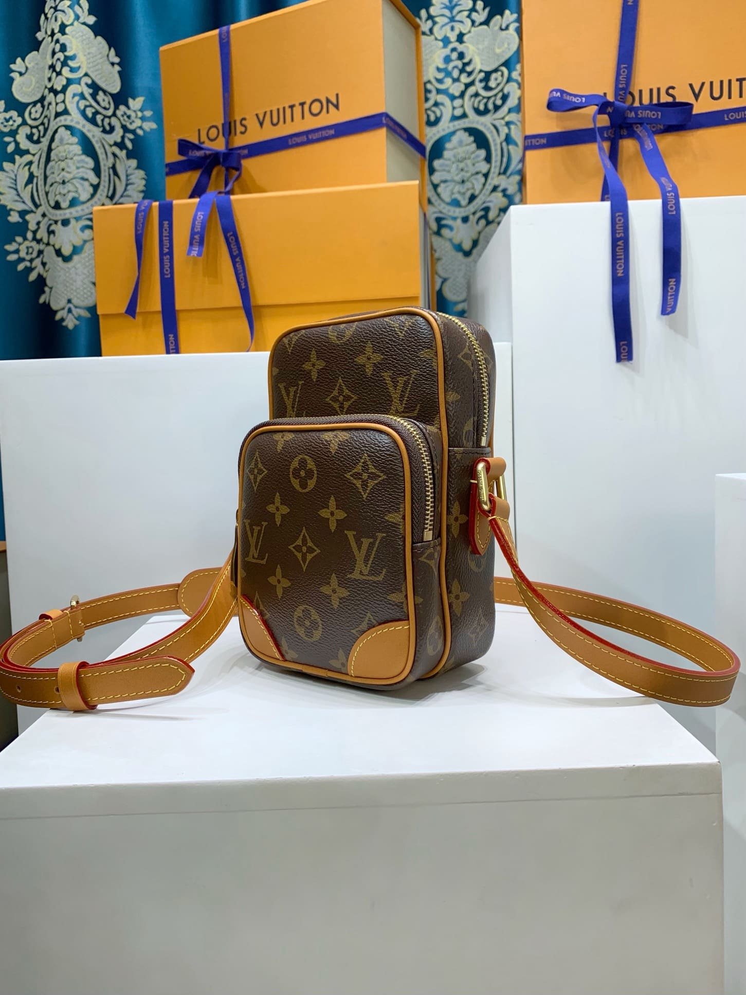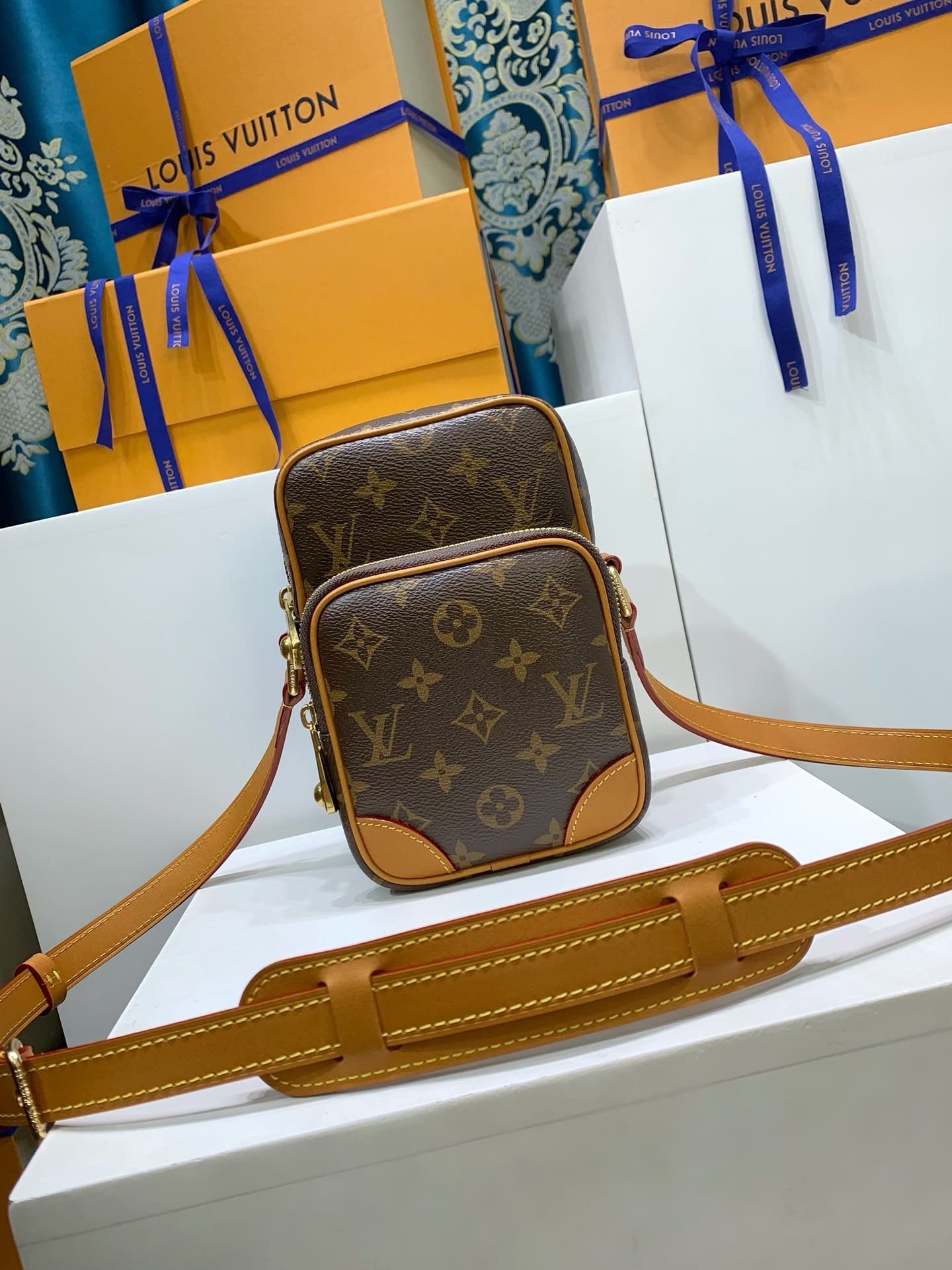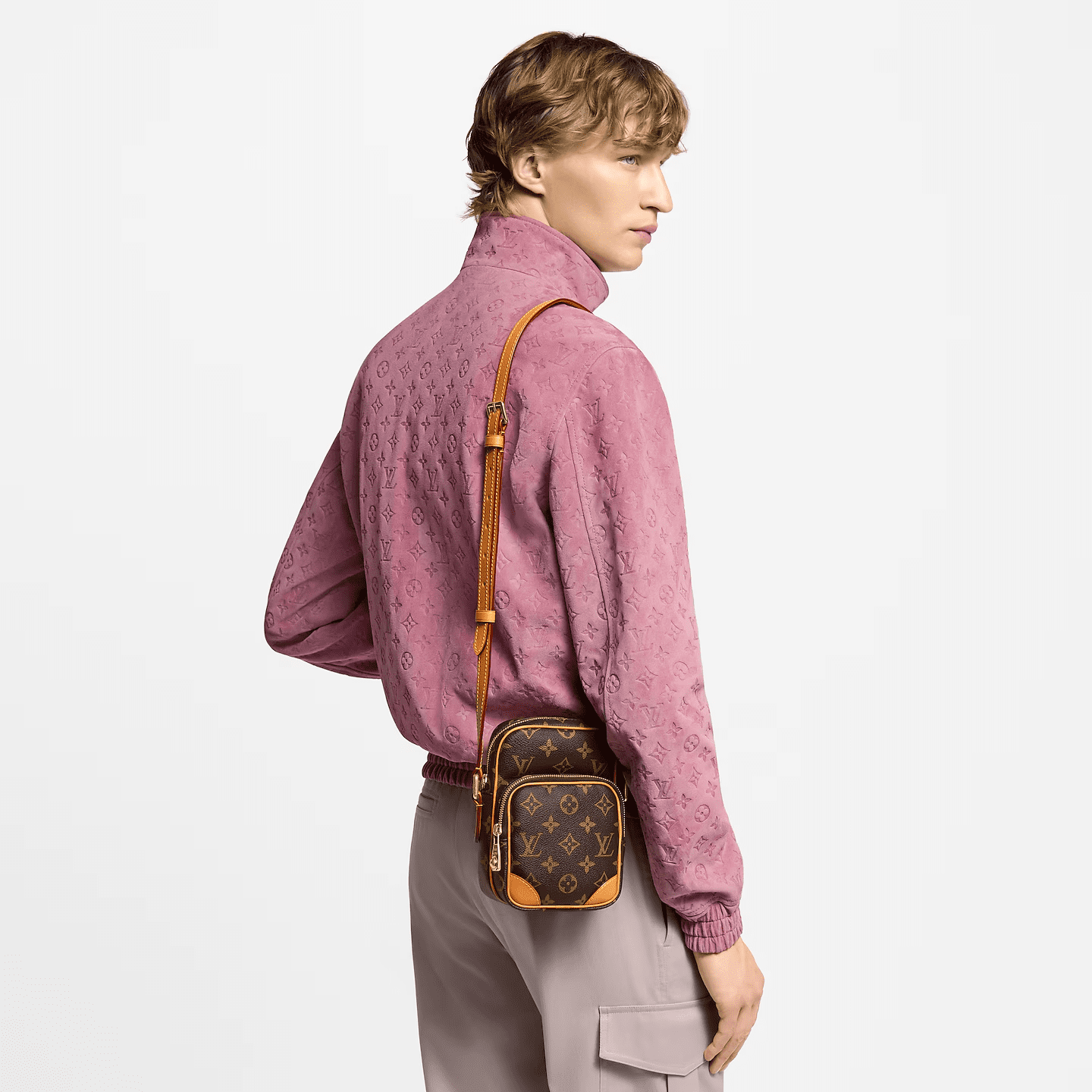 The Amazone is a stylish cross-body bag made from Monogram canvas with aged leather corners, piping, and removable strap. Inspired by designs from the 1980s, Pharrell Williams creates a compact bag that blends vintage charm with modern sophistication. The zip-pulls are adorned with pearl. The adjustable strap ensures comfortable carry.