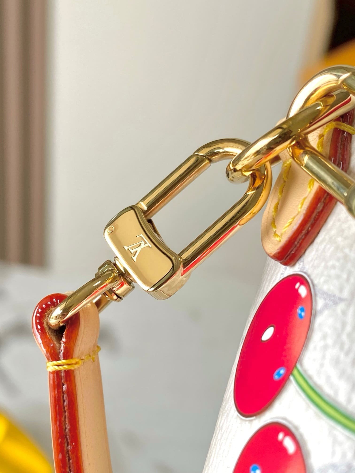 Informed by an archival 00s design, the Wallet On Chain Ivy is playfully revisited as part of the joyful re-edition of the Louis Vuitton x Murakami collection. It is crafted from Monogram canvas in an understated colorway, which is overlaid with vibrant cherry motifs in the Japanese artist’s signature kawaii style. It can be worn over the shoulder with a natural leather strap or a golden chain.