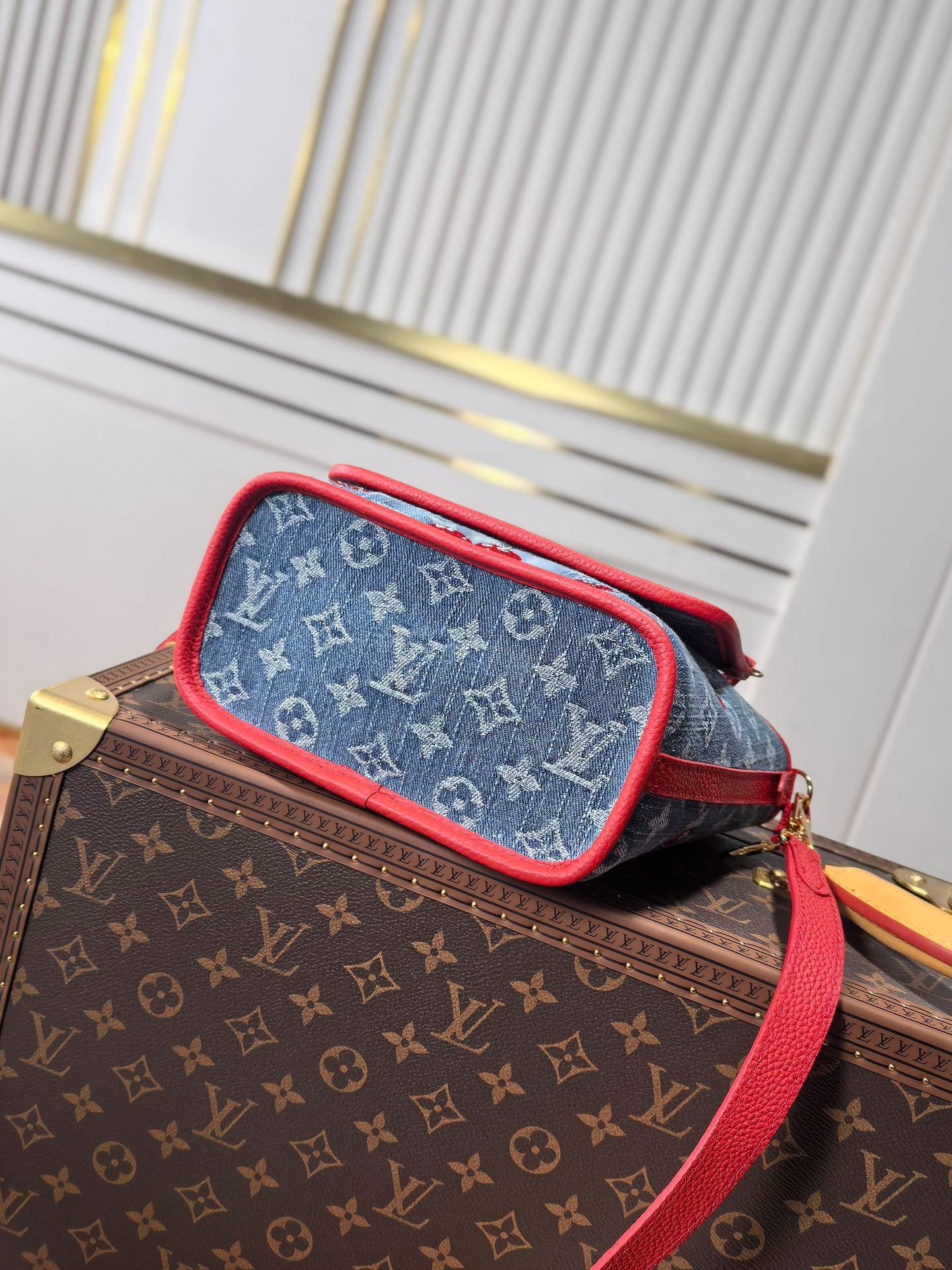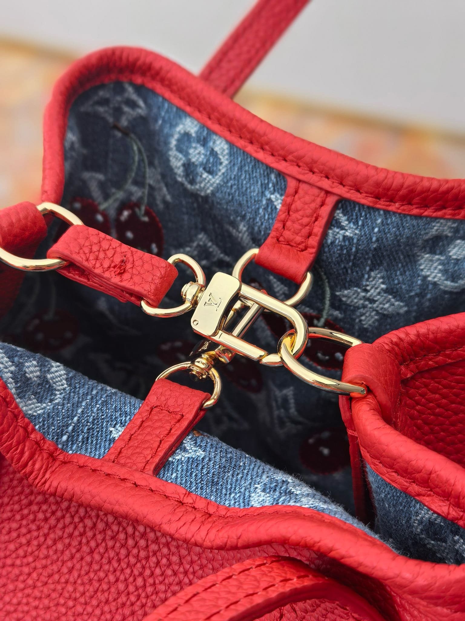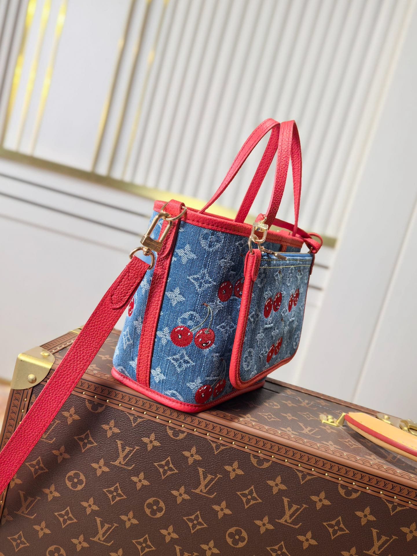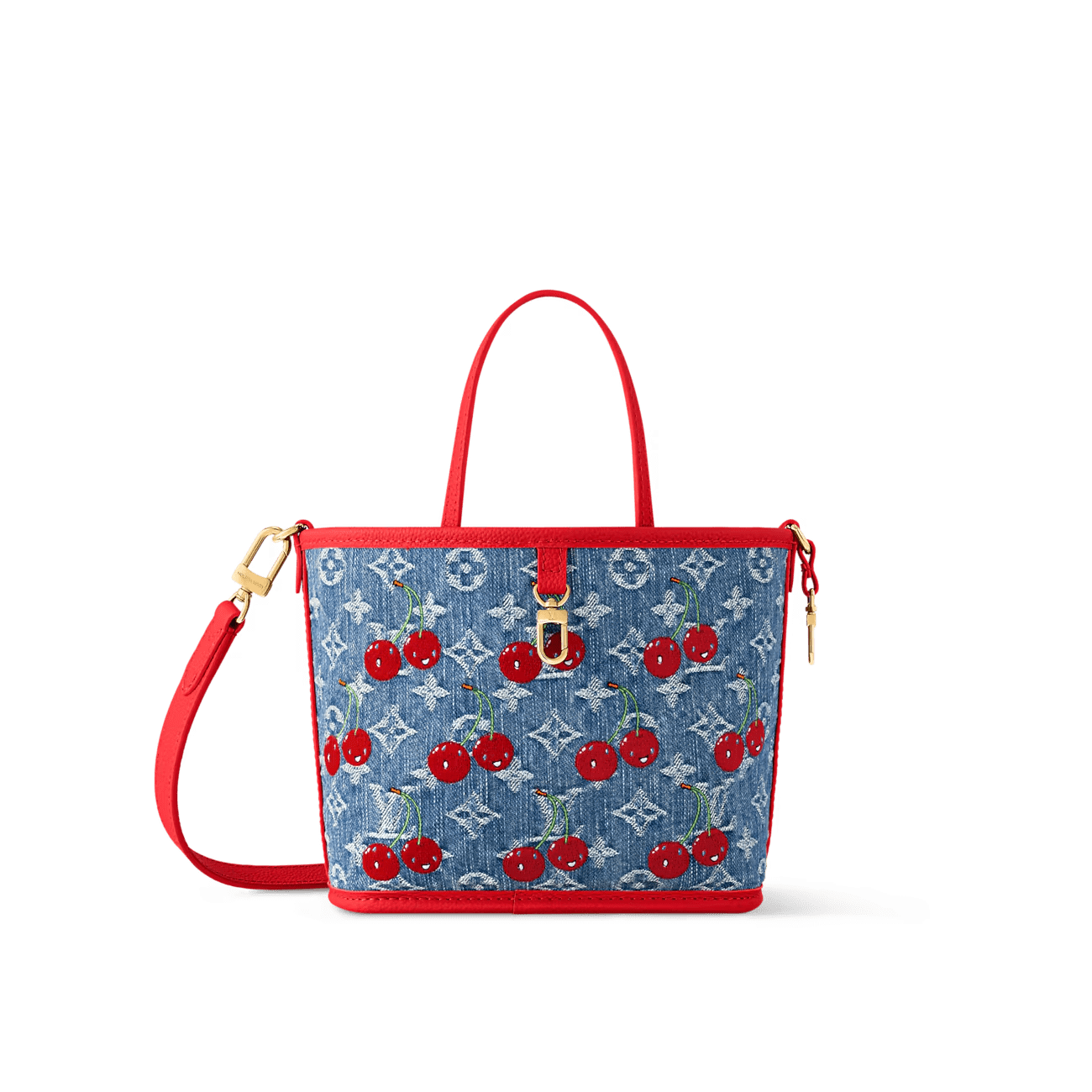 Striking signatures from the exclusive re-edition of the cross-category Louis Vuitton x Murakami collection elevate the Neverfull Inside Out BB into a playful statement piece. Crafted from Monogram denim, embroidered cherry motifs in the Japanese artist’s iconic style introduce a vibrant burst of color, which is complemented by red calf-leather trims. A removable denim zipped pouch completes this exclusive model.