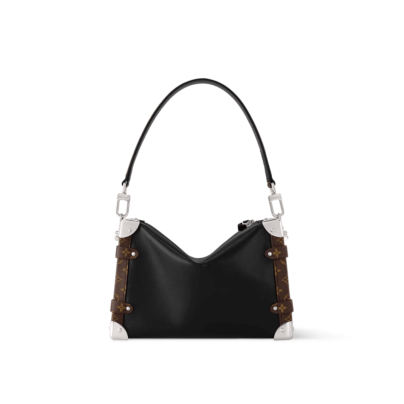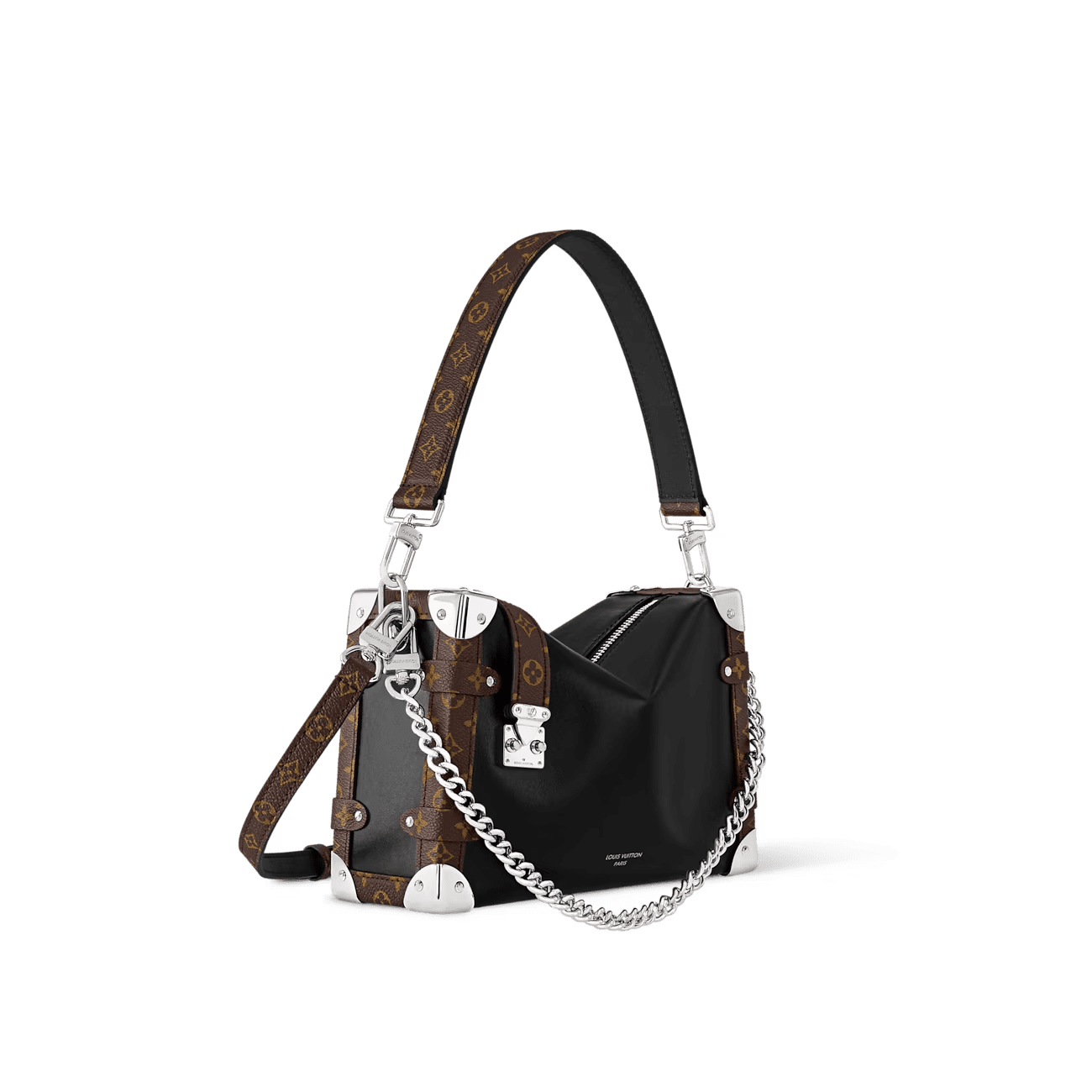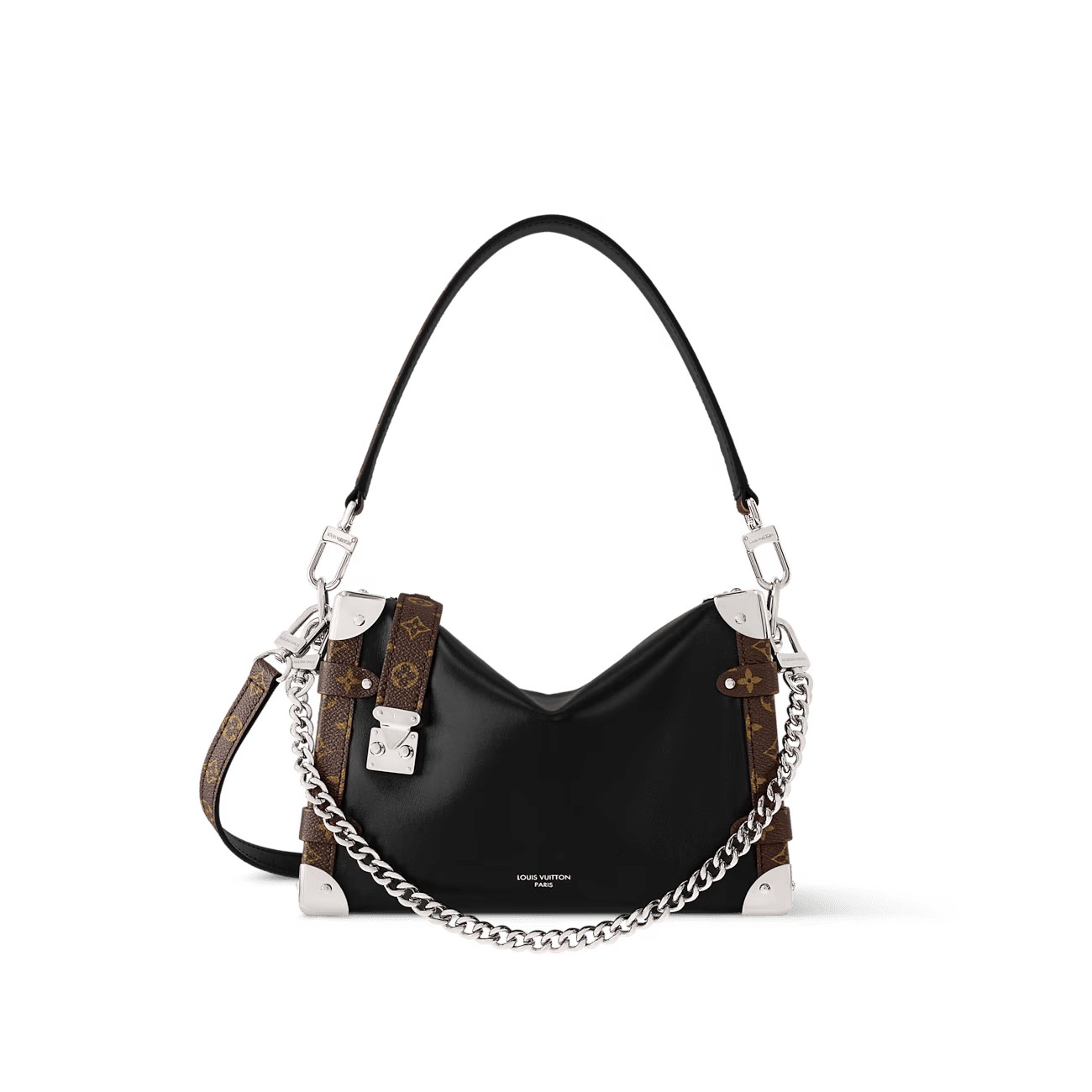 The Side Trunk Vibe is a fashion-forward take on our iconic Side Trunk shape that takes its design cues from Louis Vuitton’s historic trunks. Crafted from calfskin in a smooth and shiny “Vibe” finish, it is embellished with a riveted frame and S-lock in black leather and silver-tone metal, giving it a rock’n’roll vibe. This model offers different carry options thanks to its removable chain, removable leather handle, and removable, adjustable leather strap.