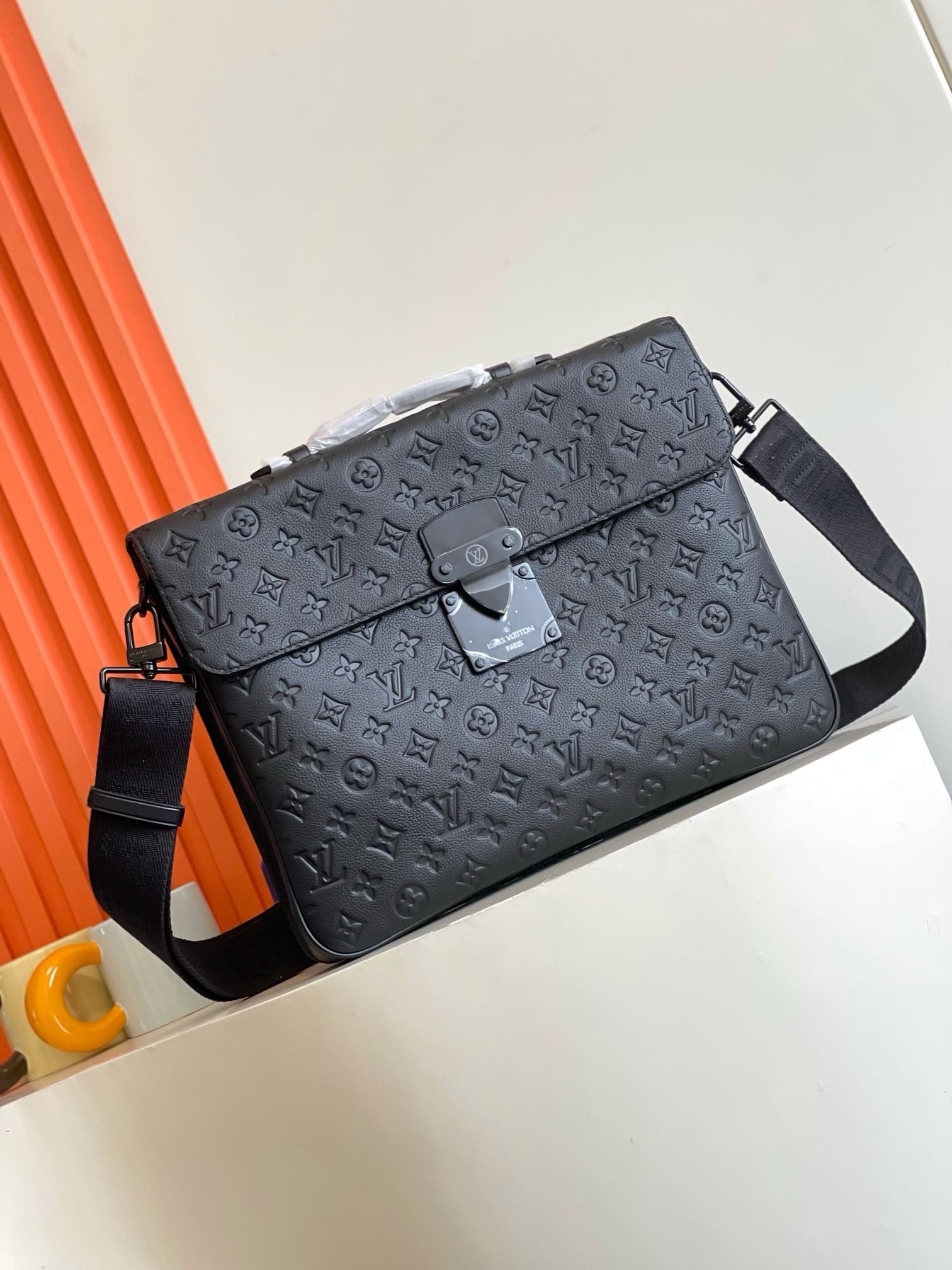 Crafted in elegant black Taurillon Monogram leather, the sleek and sophisticated S-Lock Briefcase features an array of rich details, from the magnetic clasp styled after a historic Louis Vuitton trunk lock to the signed adjustable shoulder strap. A secure and practical carrier for the modern-day businessman, it updates the traditional briefcase with a refined signature look.