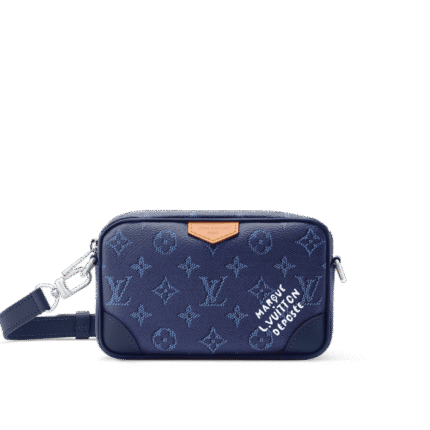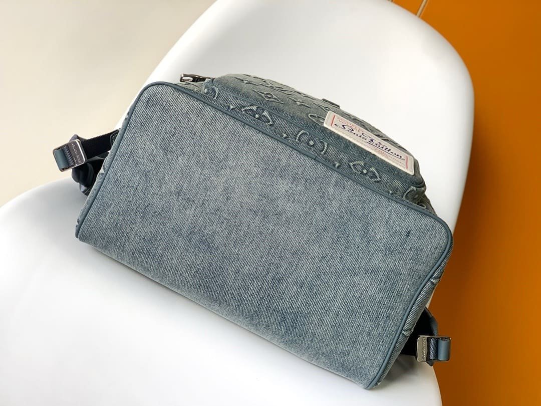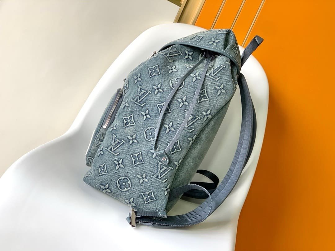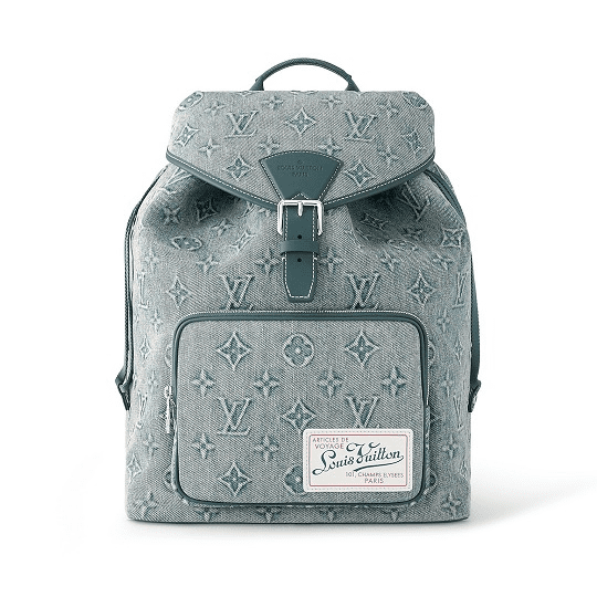 The Montsouris backpack features a Monogram pattern embossed on faded denim for a personal alternative to classic design. Drawstrings gather the soft structure, and the vintage label is from the brand’s archive.