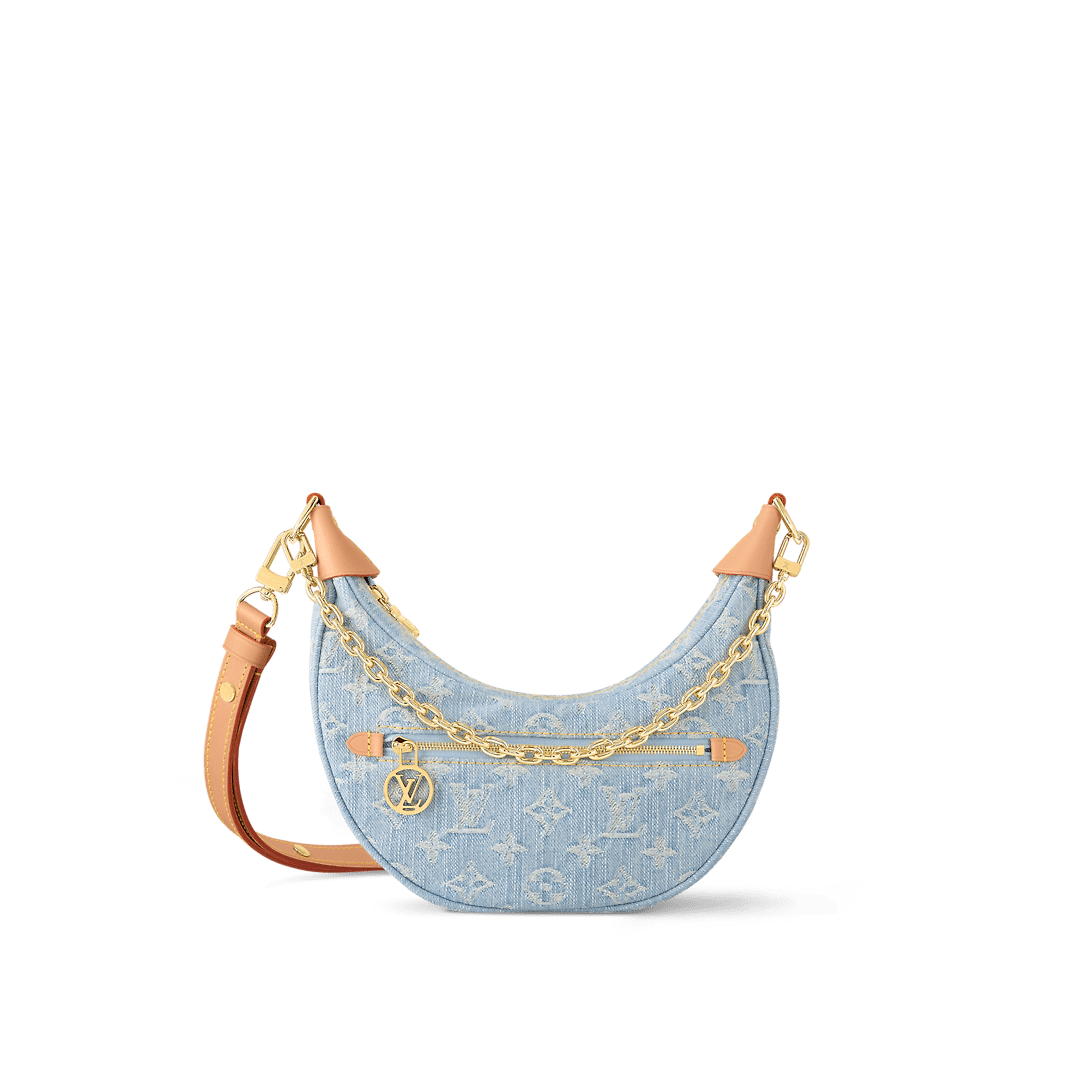 The Loop is made from Monogram Denim, a stylishly fresh take on the ultimate summer fabric. The bag’s half-moon shape is highlighted by the leather corners. A removable and adjustable leather strap and a detachable gold-color chain give carry options. The zipped front pocket gives access to essentials.