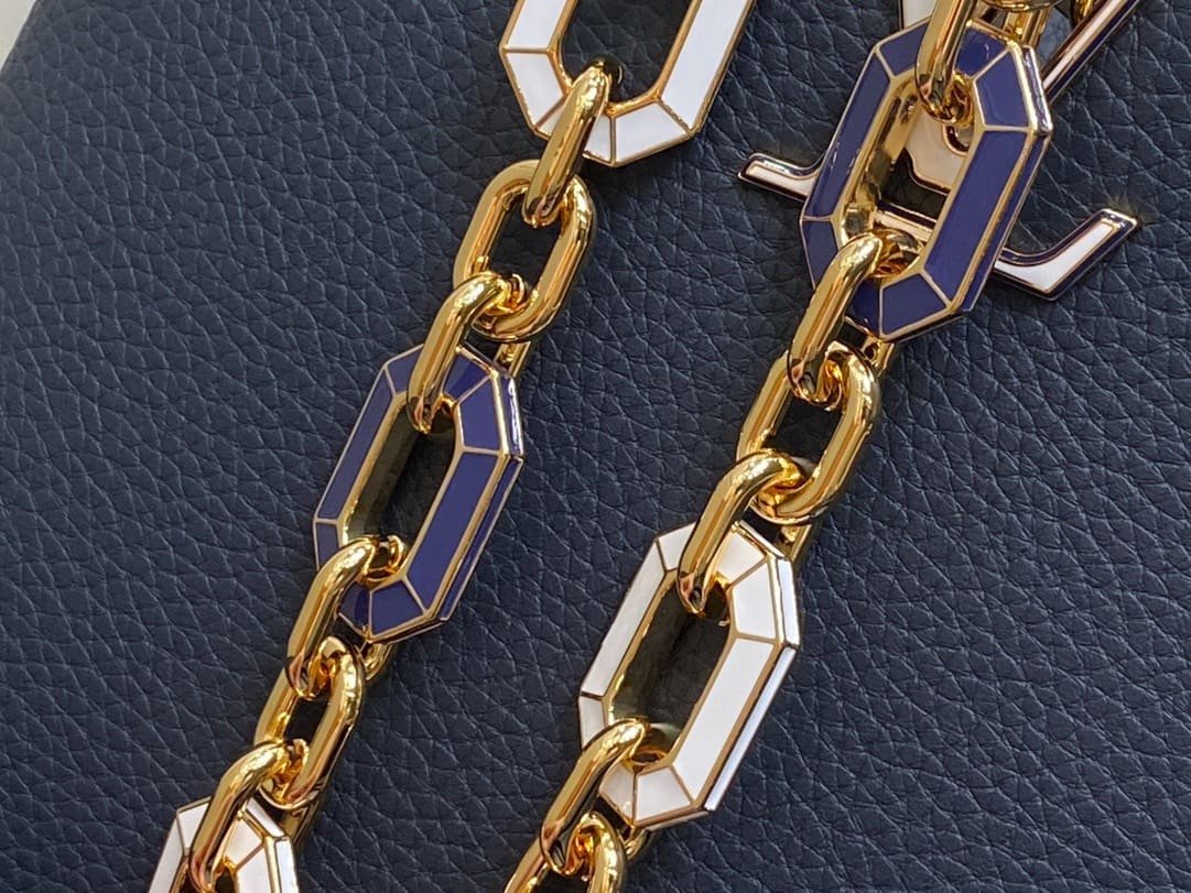 The Capucines BB bag is crafted from grained Taurillon leather and features a delicate chain with octagonal links inlaid with elegant enamel for a jewellery-like feel. Its compact shape can accommodate a smartphone, a long wallet and other small items.