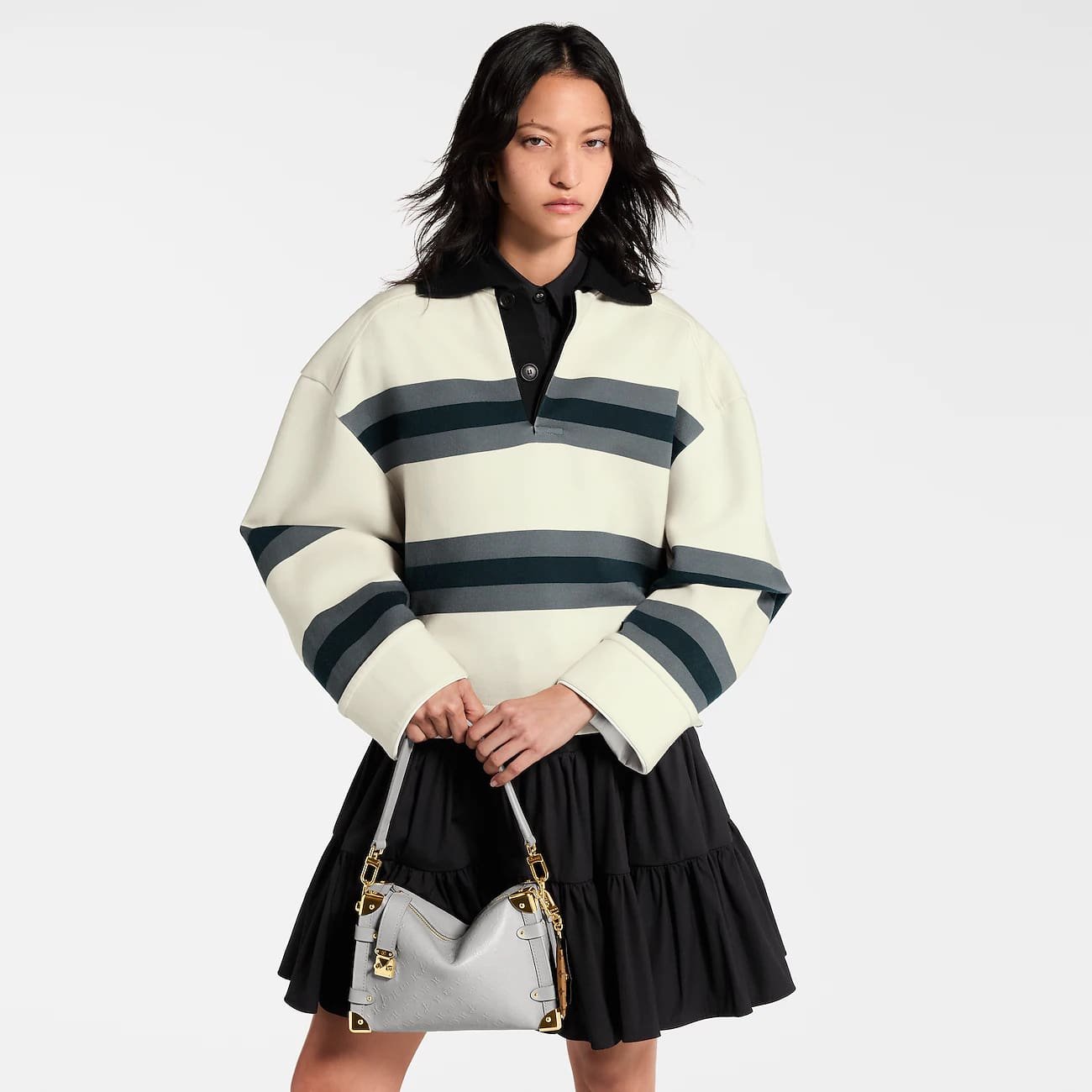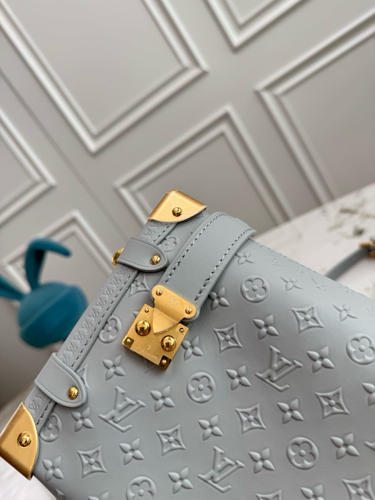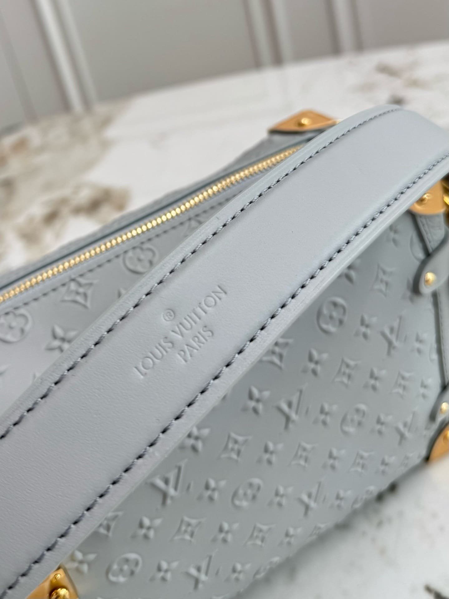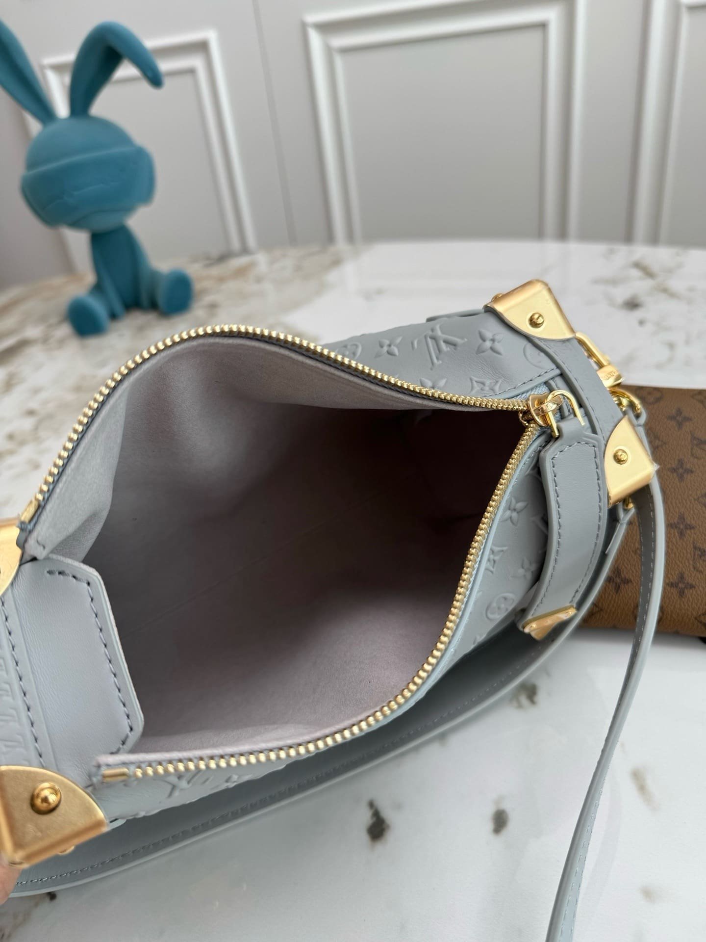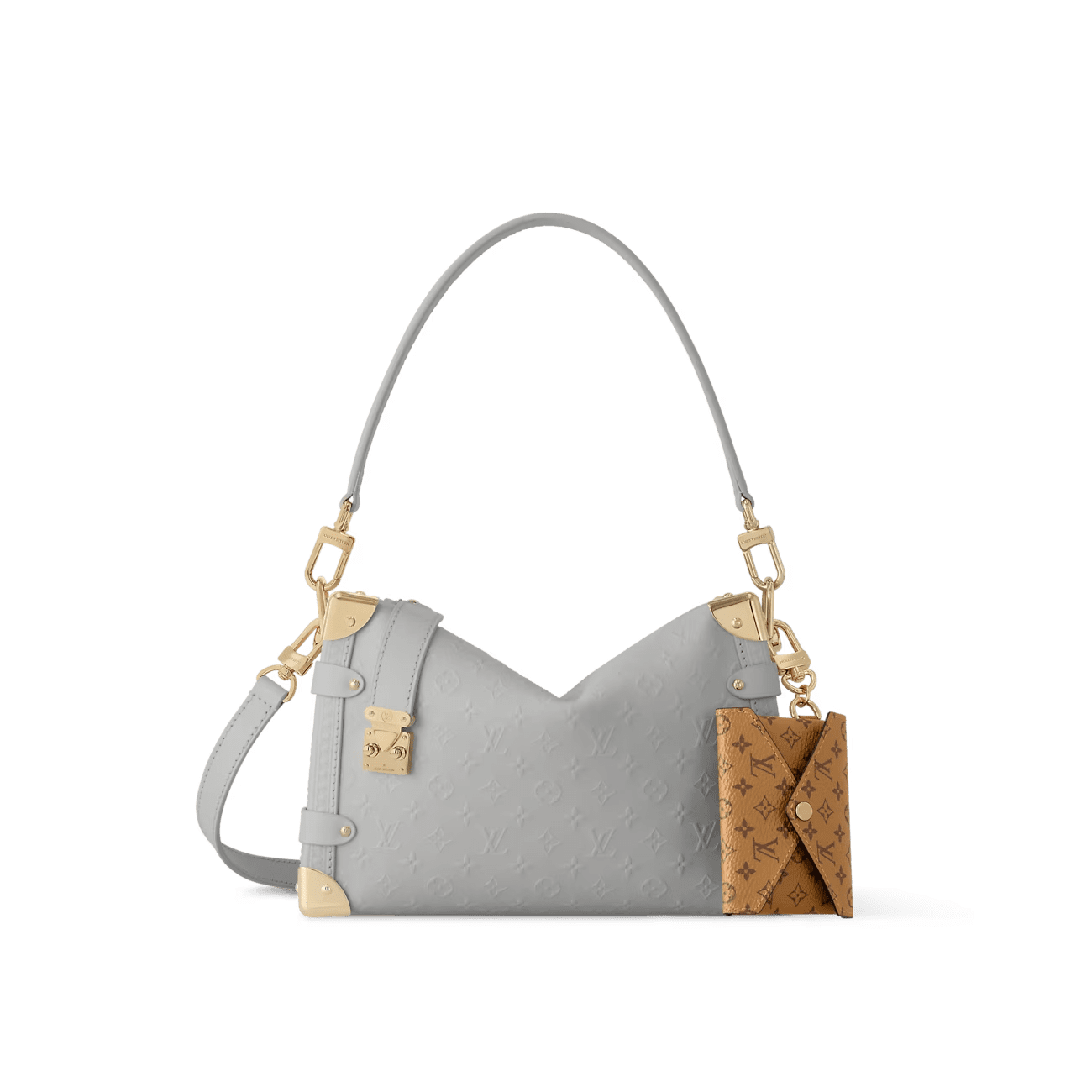 Introducing the Minigram Bold signature, which decorates this chic edition of the Side Trunk MM. The subtle pattern is debossed onto calfskin leather and accented with gold-toned hardware, including trunk details that pay tribute to the House’s iconic heritage. Note the contrasting Monogram charm, which depicts the original show invitation from Nicolas Ghesquière’s debut collection – this exclusive envelope is designed to slot a card inside if desired.