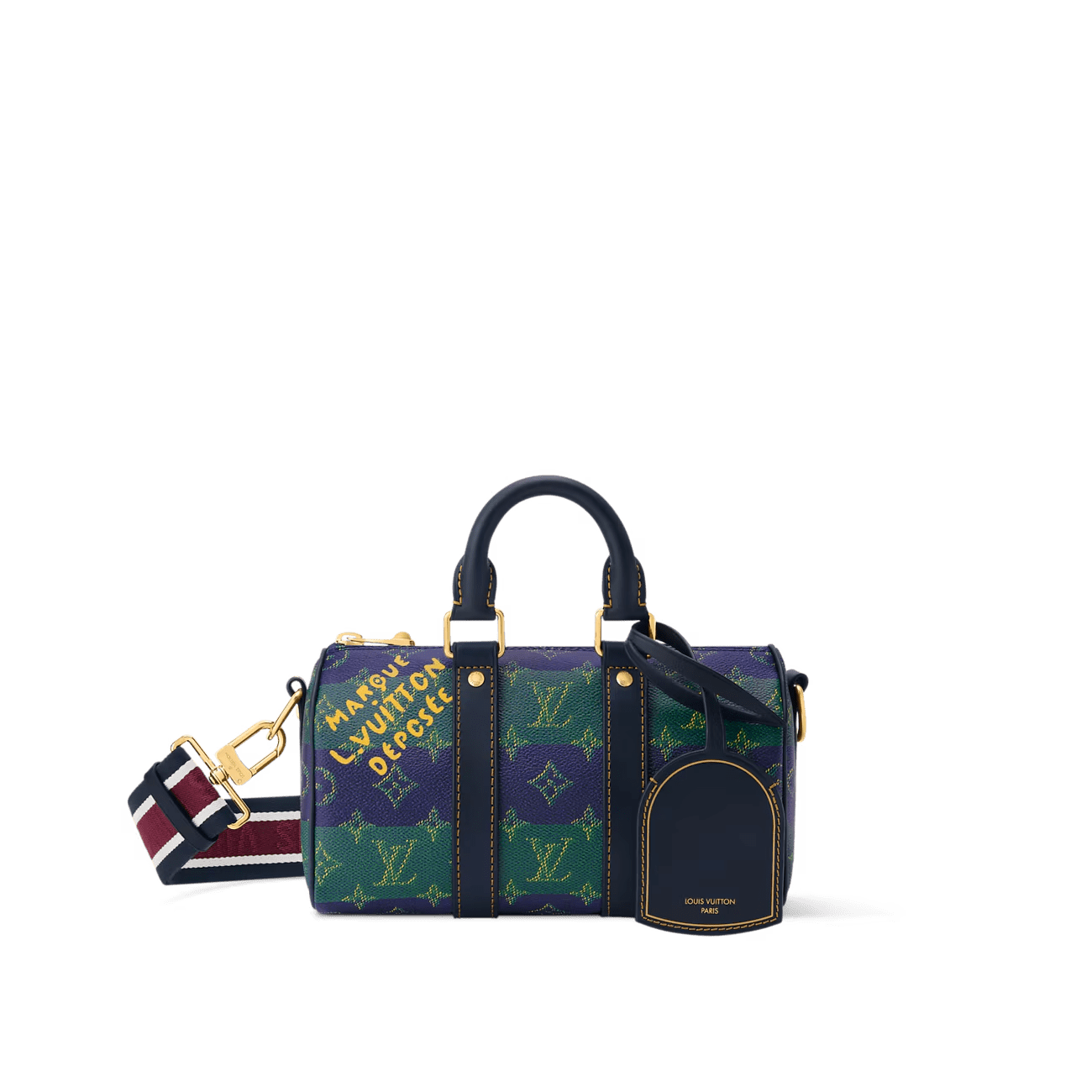 Crafted from striped Monogram Heritage canvas, the Keepall Bandoulière 25 is a stylish city bag. A name tag with contrasting stitching echoes the lateral bands and top handles. Pharrell Williams signs the piece with the “Marque L. Vuitton Déposée” emblem, originally seen on the House’s Damier pattern. A detachable striped strap allows for shoulder carry.