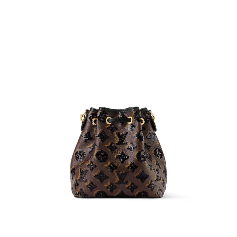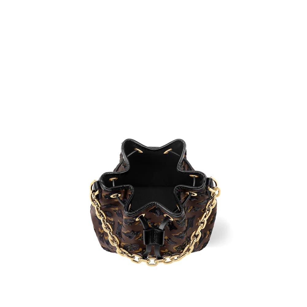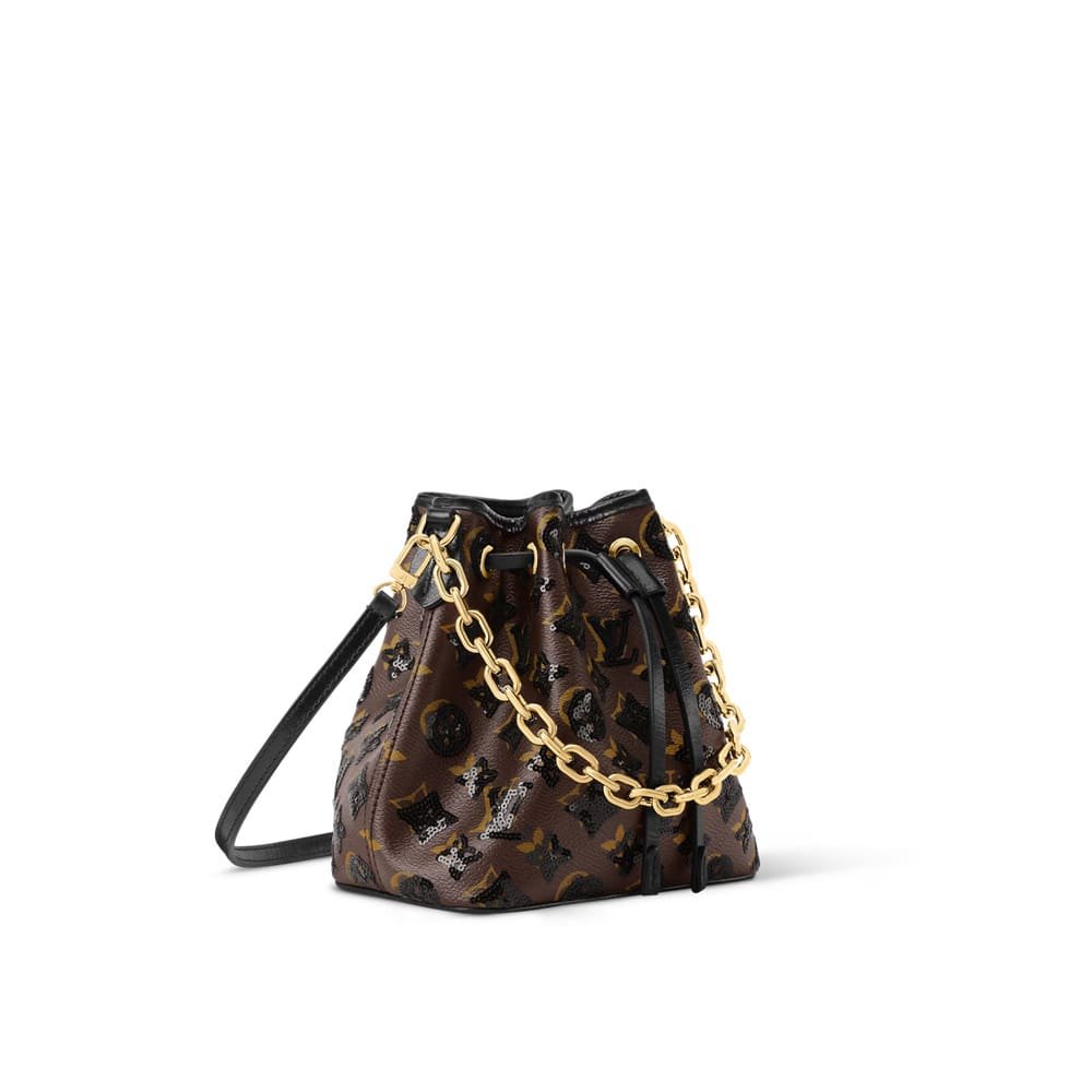 From the LV Ski collection, this shimmering edition of the Noé BB is the perfect evening option for the chalet or the city. It is made from canvas embellished with glittering sequins to create the House’s emblematic Monogram pattern. The iconic style is reimagined from the 1932 original with an additional chunky gold-toned chain. It is sized to fit the essentials, including a favorite lipstick.