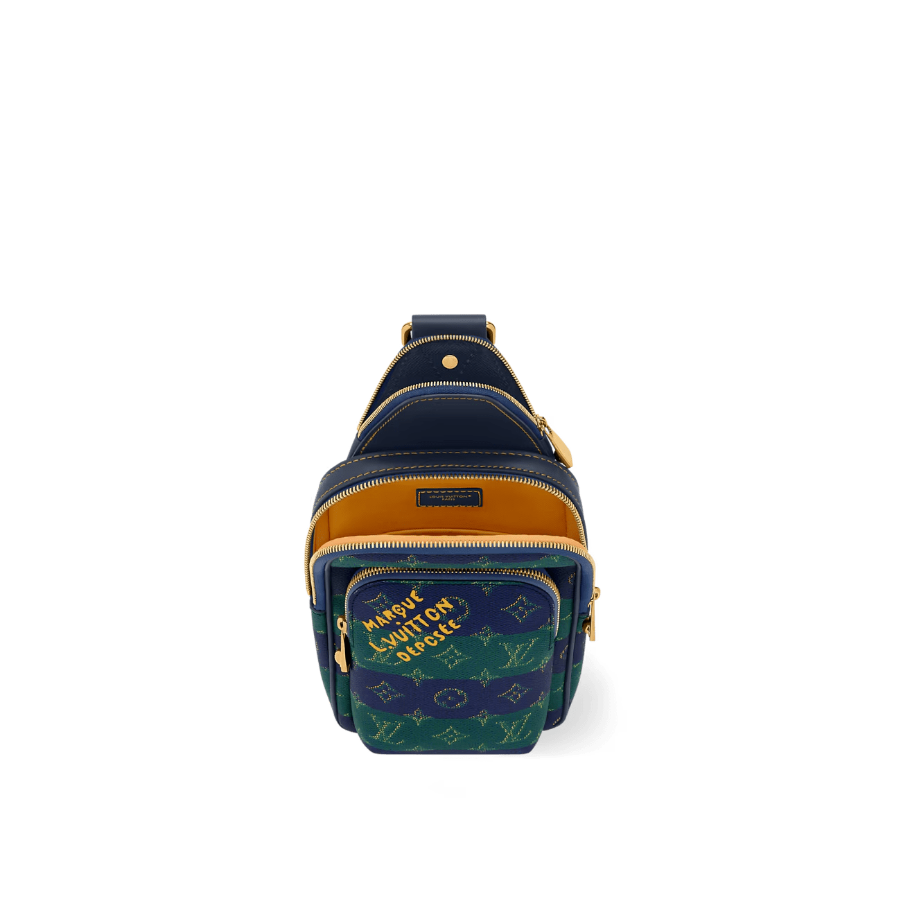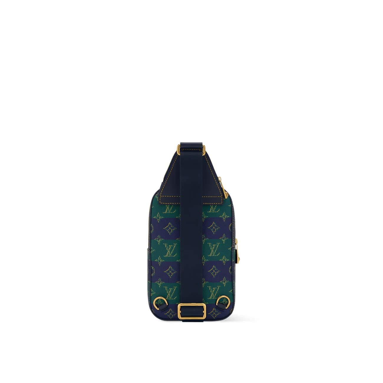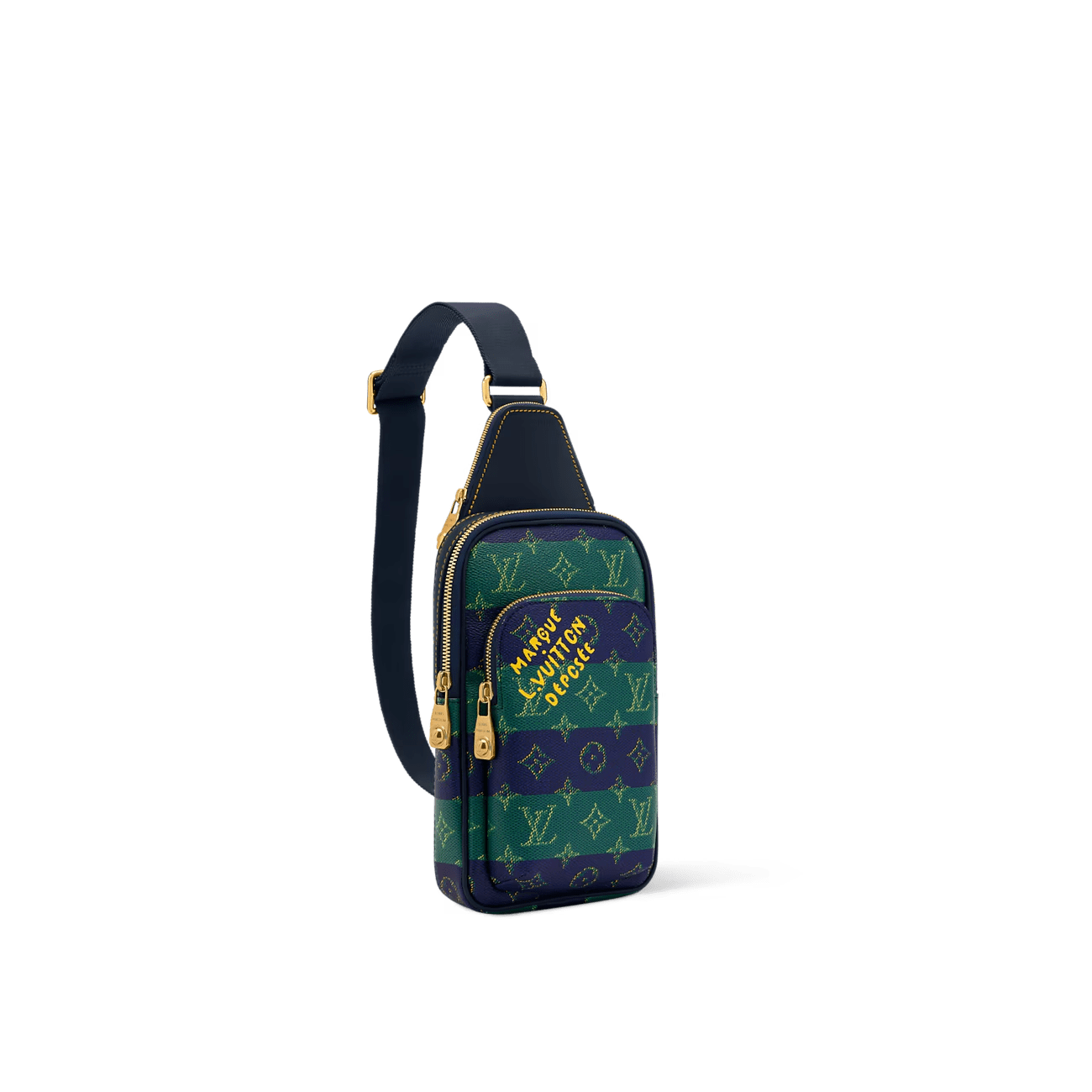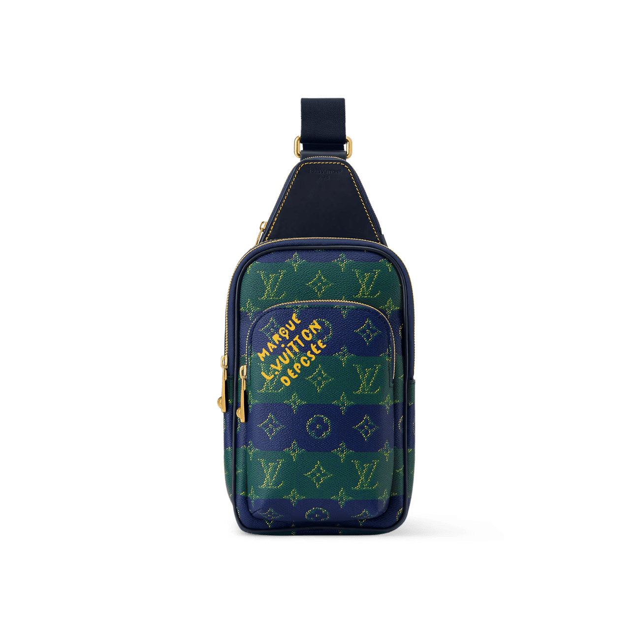 Fashioned from striped Monogram Heritage coated canvas with blue-leather trim, this Avenue Slingbag PM is a practical small bag. This cross-body bag has a zipped main compartment, lined in saffron-colored textile, and a convenient front zipped pocket. For smaller belongings, there’s a triangular pocket attached to the top of the bag where it meets the strap.