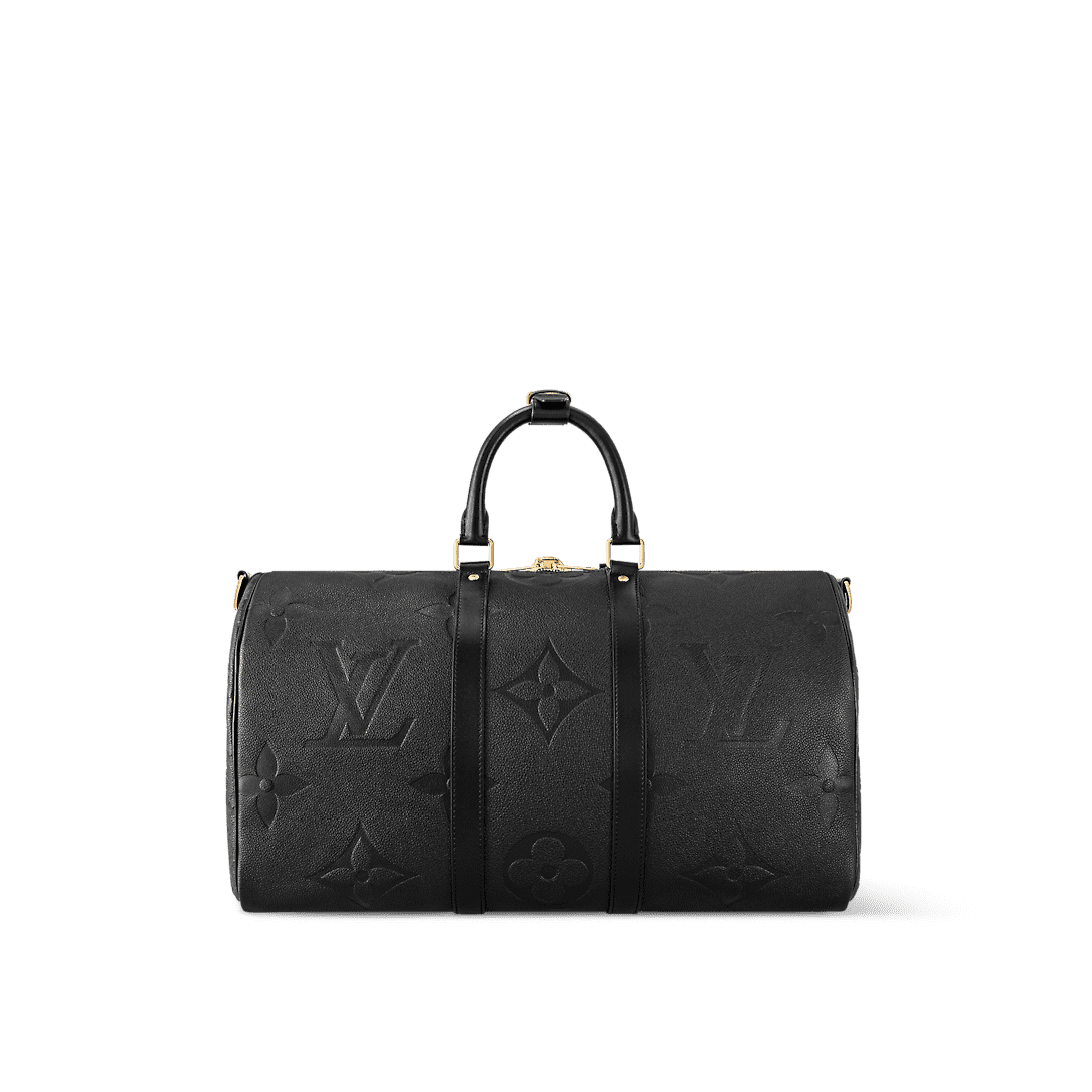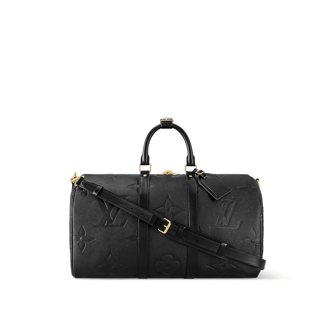This Keepall Bandoulière 45 is fashioned from Monogram Empreinte Giant leather with gold-color hardware. The supple black cowhide is embossed with an oversized Monogram pattern, giving an understated elegance to this classic soft travel bag. Inside, the colored lining brings a graphic feel whilst the zipped pocket makes it functional.