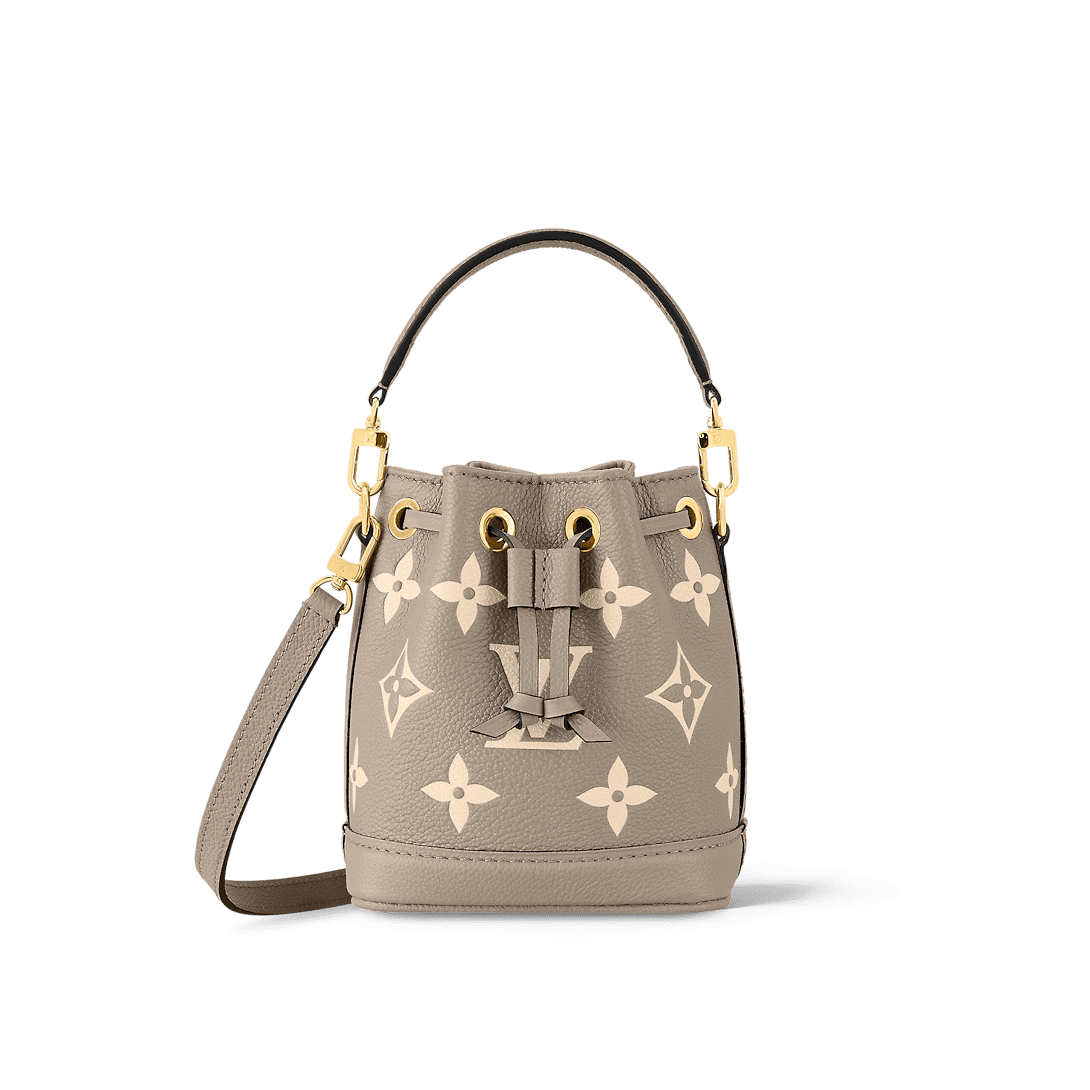 This bicolor version of the Nano Noé is crafted from supple Monogram Empreinte leather, embossed with the Monogram pattern. This miniature replica of the iconic Noé bag is a stylish way to carry everyday essentials. In addition to its practical drawstring closure, it features a removable handle and a removable, adjustable shoulder strap for different carry options.