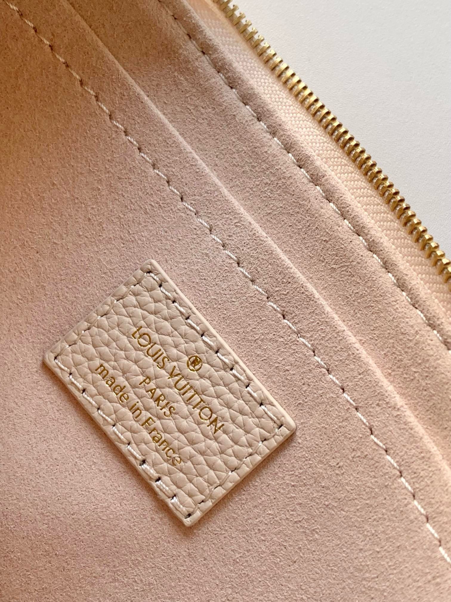 Made from cream-colored Monogram Empreinte leather, the Multi Pochette Accessoires handbag is composed of two pouches attached together. Both pouches are lined with matching cream-color microfiber, with the larger pouch also including an inside pocket. Thanks to a chain and a strap, both removable, this bag becomes very verstaile.