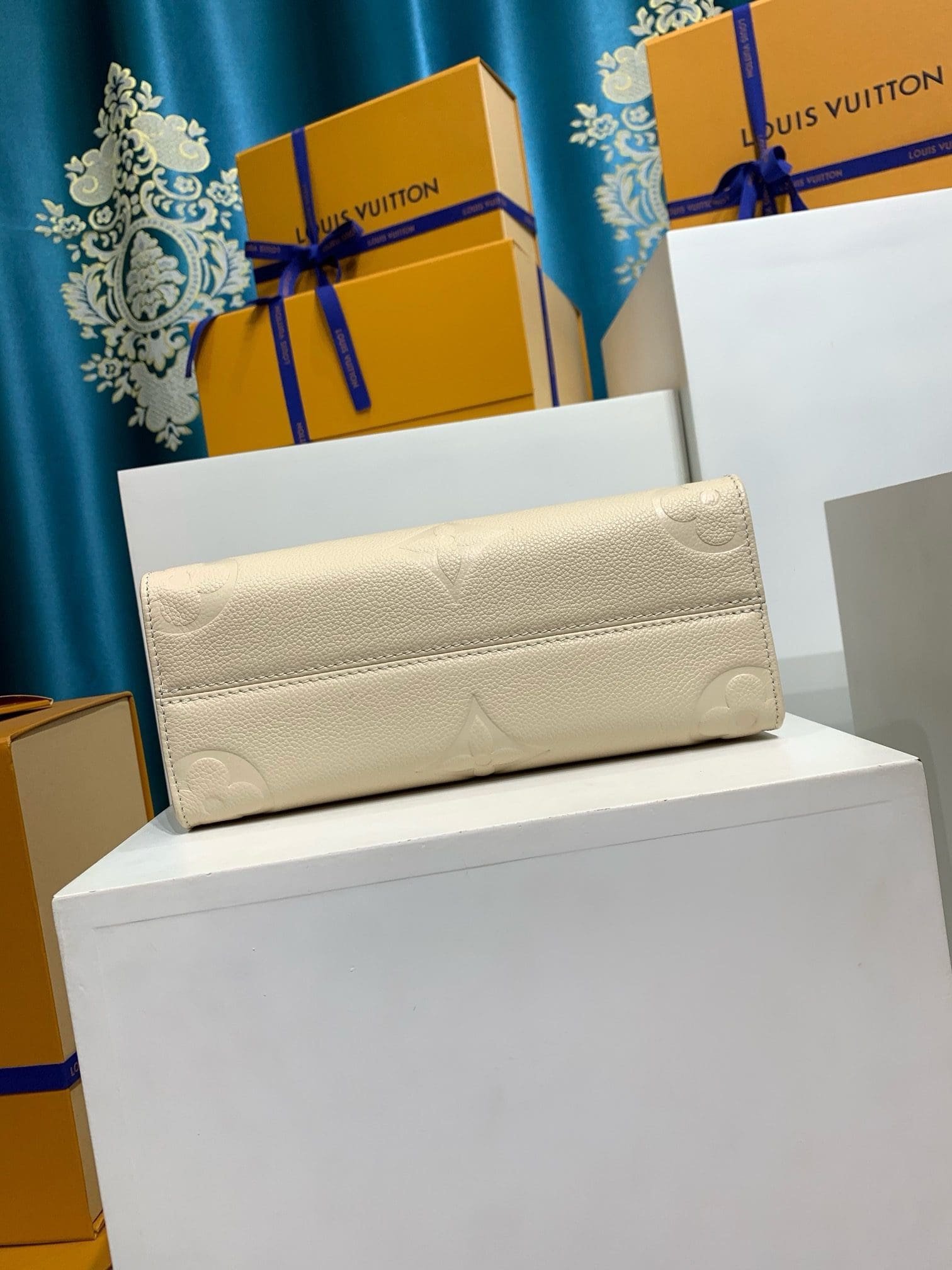 A soft cream-tone makes the Monogram Empreinte leather of this OnTheGo PM bag seem luminous. The LVs and Monogram Flowers embossed into the leather are perfectly complemented by the rectangular lines of this small tote. It can hold smaller essentials like an iPad Mini. Two rolled-leather top handles and a detachable strap give carry options.