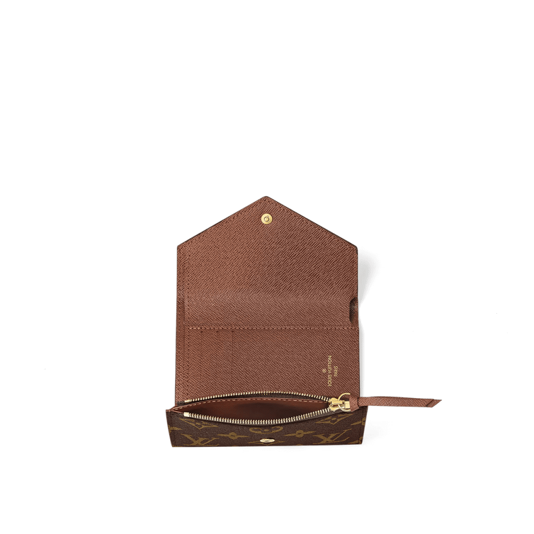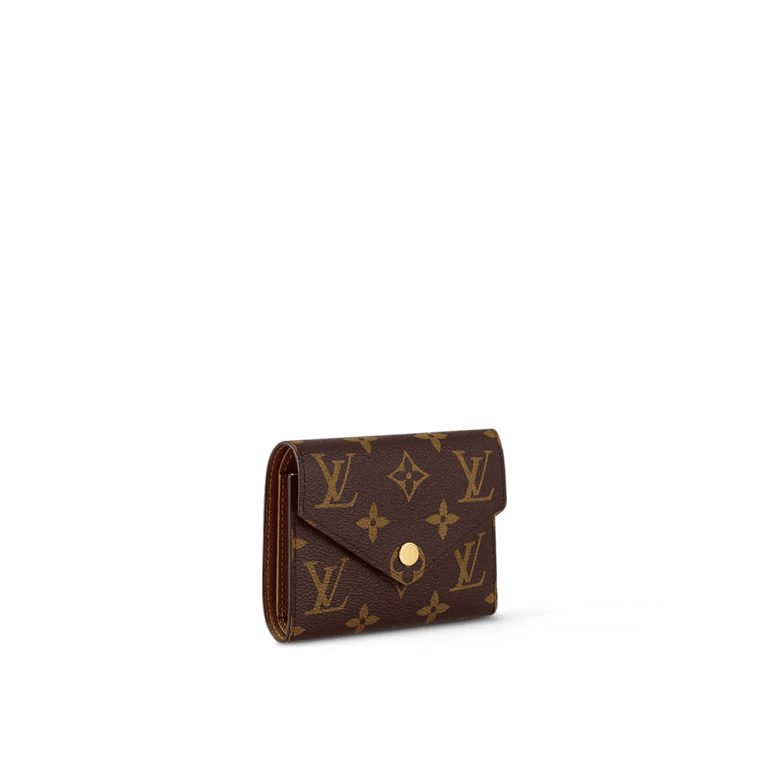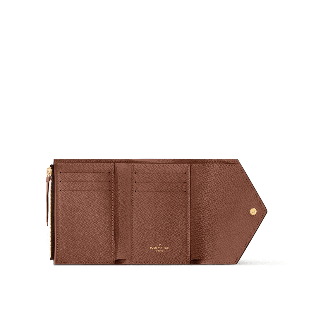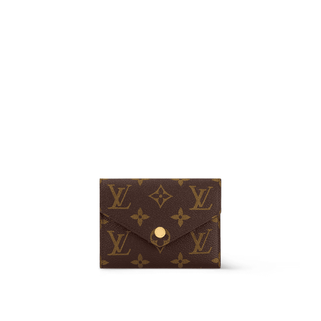 The compact Victorine wallet in Monogram canvas combines femininity and functionality. It opens out to reveal many practical features, including card slots and pockets for bills and coins. Its envelope-style flap is sealed with a press-stud.