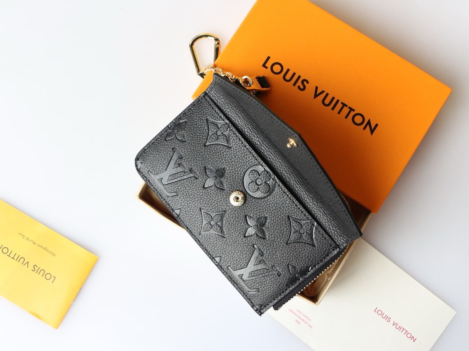 The Card Holder Recto Verso in Monogram Empreinte leather is an ingenious, multi-functional design. Among its practical features are a compartment with a wide, L-shaped zip, which can hold coins, an in-between pocket for folded bills, an envelope-style front pocket, and three card slots. It can also be hooked onto a bag or belt.