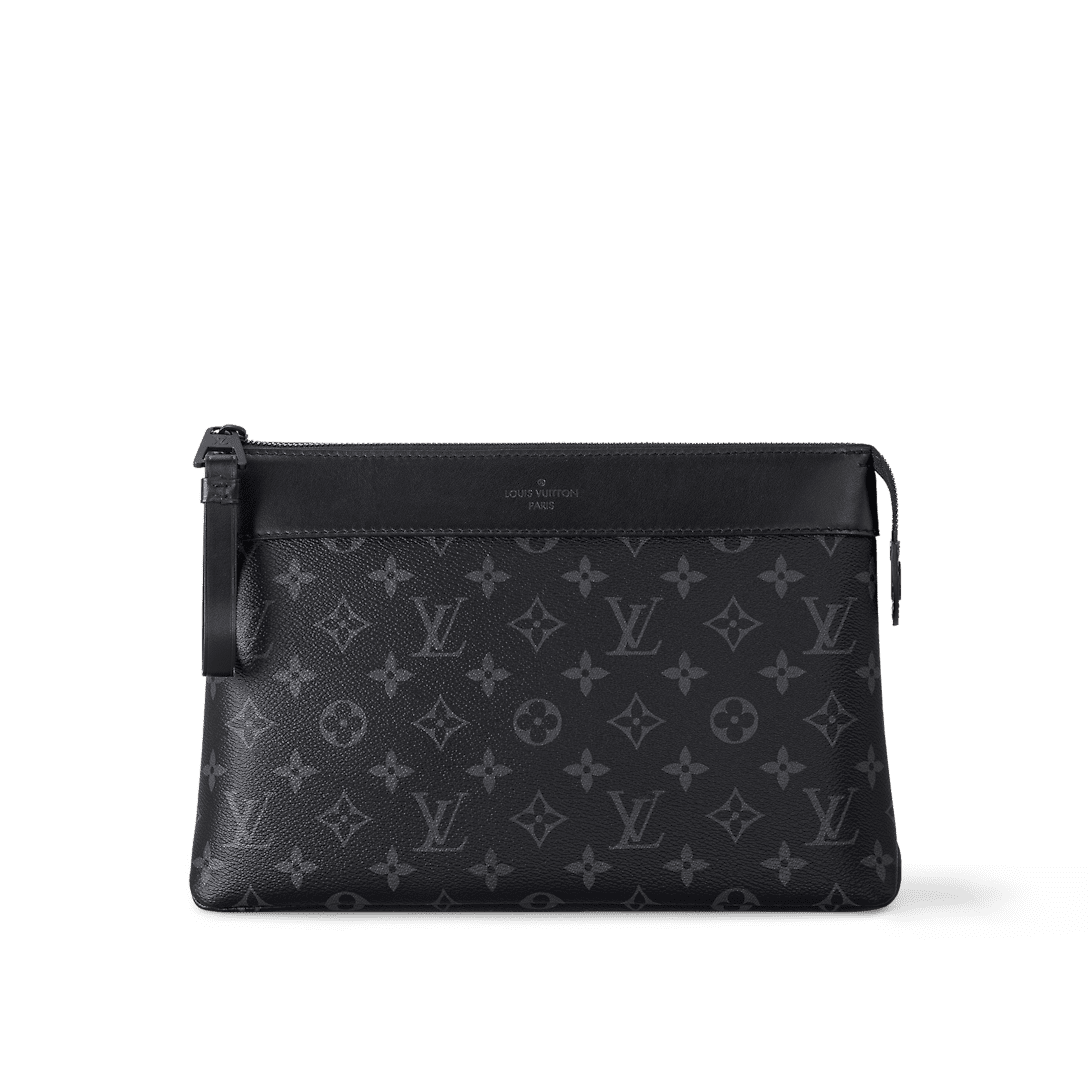 The Pochette Voyage Souple Clutch is crafted from soft Monogram Eclipse coated canvas, with rounded strokes that echo the lines of the classic Pochette Voyage Clutch for a comfortable on-the-go experience. The slim silhouette features a zip compartment and magnetic back pocket.