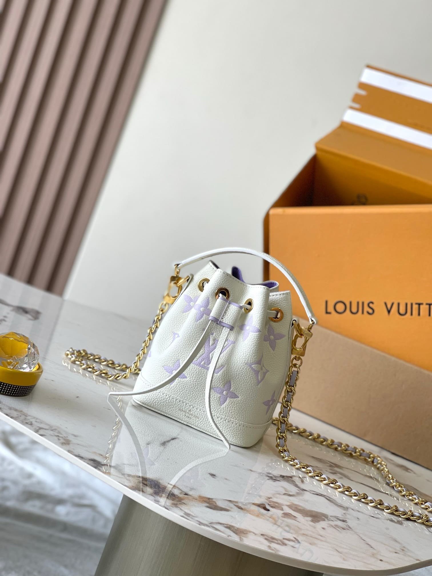 This seasonal edition of the Nano Noé bag comes in supple, embossed Monogram Empreinte leather in a delicate, bicolor palette. Notable for its drawstring closure, this miniature replica of the iconic Noé bag offers several carry options thanks to its removable handle and removable, gold-tone chain, which is interlaced with leather.