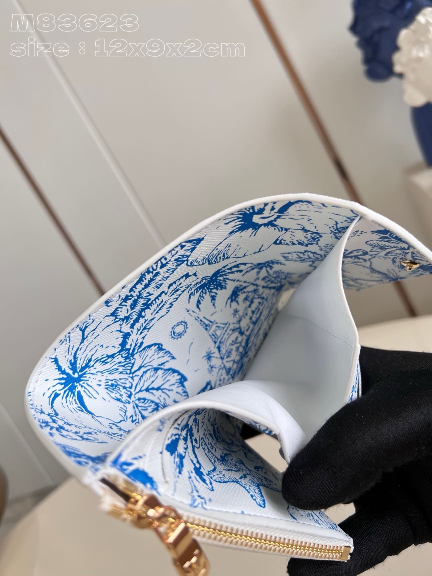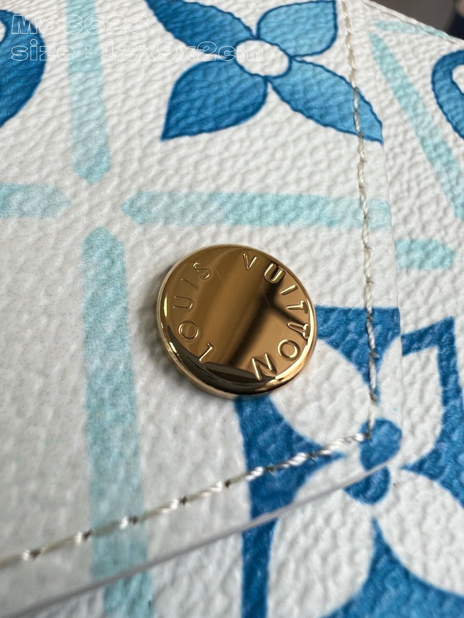 For the LV By the Pool summer collection, the Victorine wallet is reinterpreted in coated canvas with a vibrant Monogram Tiles print, inspired by the Mediterranean. Notable for its square format, this tiny, envelope-style wallet is surprisingly spacious, offering pockets for coins and bills, as well as six card slots.