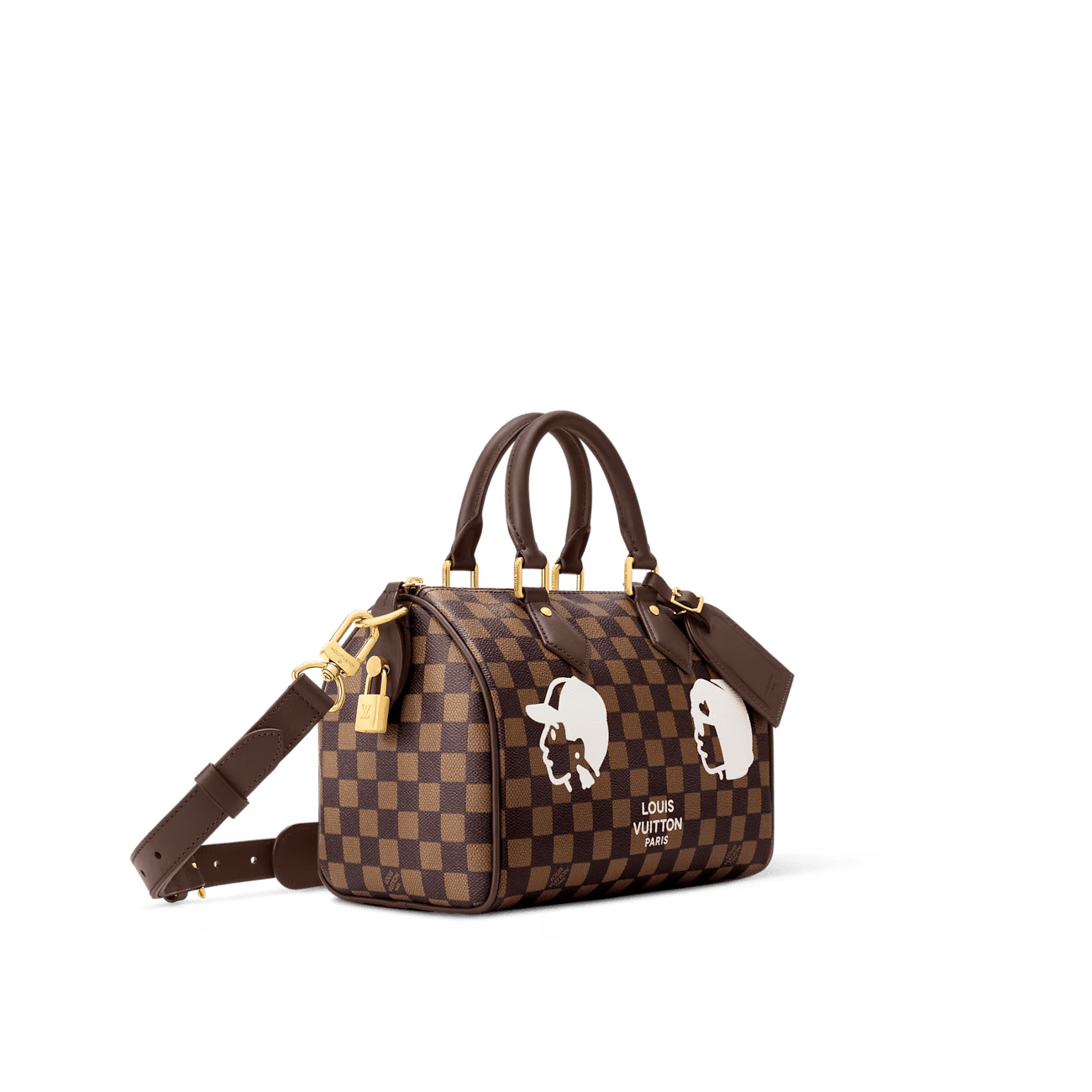 This Speedy 25 Bandoulière is crafted from Damier Phriendship canvas, a reinterpretation of Damier Ebene canvas adorned with portraits of Pharrell Williams and his frequent collaborator Nigo. The bag’s luxurious feel is enhanced by crafted details and a striking graphic lining designed by Nigo.
