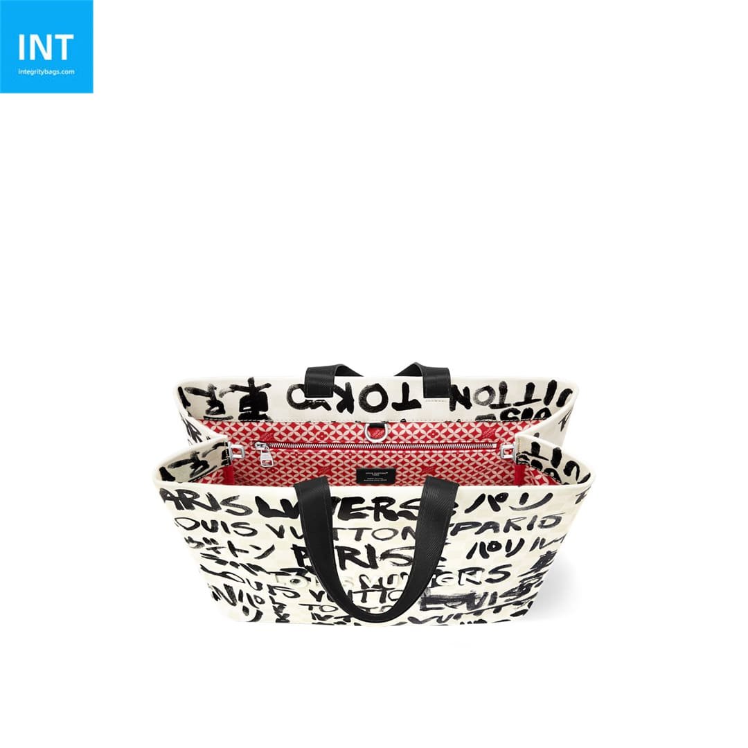 This medium-sized Shopper Tote features a Damier checkered pattern overlaid with striking hand-painted elements, showcasing the collaborative creativity of Pharrell Williams and Japanese designer Nigo. The bag is adorned with the names Louis Vuitton, Paris, and Tokyo in both French and Japanese, along with the LVvers logo, all contributing to Nigo’s signature style, complemented by a patterned cotton lining.