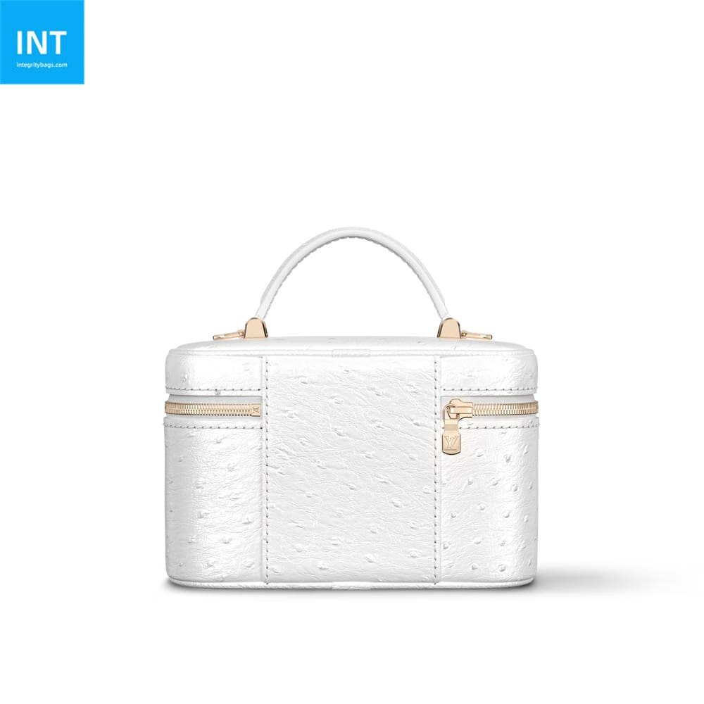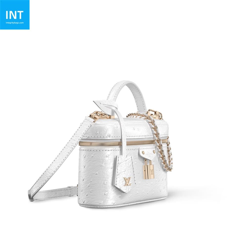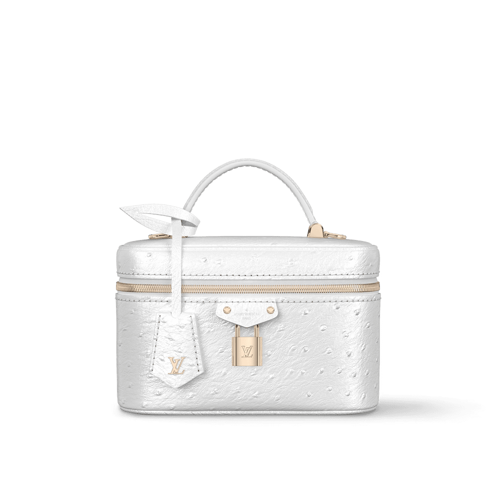 Inspired by heritage vanity cases, the Vanity Chain Pouch in ostrich leather embodies the spirit of travel. This sophisticated, slimline bag is complemented by a goatskin trim on its top handle and removable, braided chain. It is notable for its rich signature details, including an LV-engraved padlock and a ostrich leather key bell.