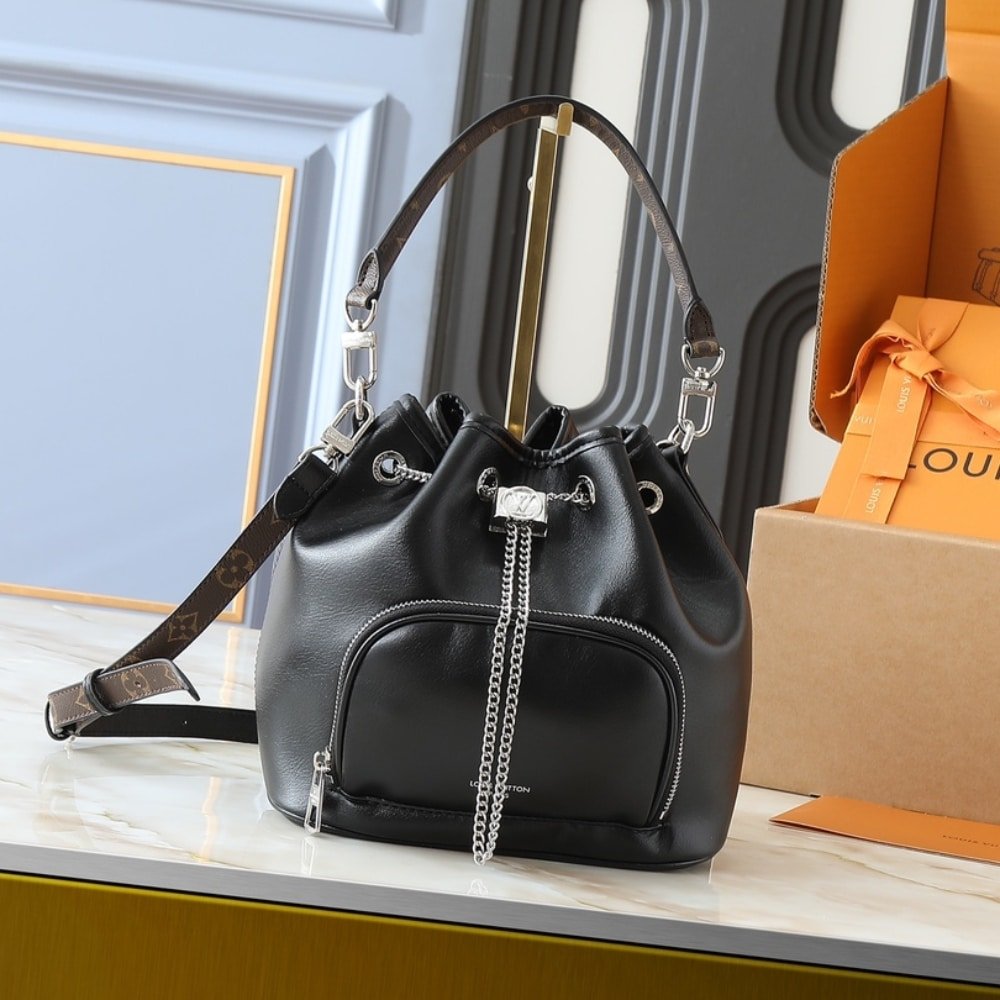 1 chain drawstring with gliding LV Circle to adjust the bag opening