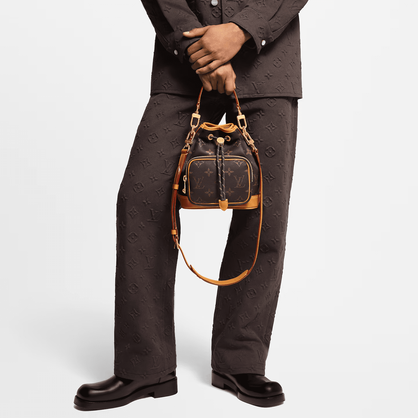 The Noé Cargo is a small bucket bag constructed from shiny calfskin leather with a technical nylon-like sheen and lined with a deep-toned fabric. Hardware, including the LV monogram attached to a ball chain, are the only accents of color on this monochrome bag. Roomy front interior pocket.