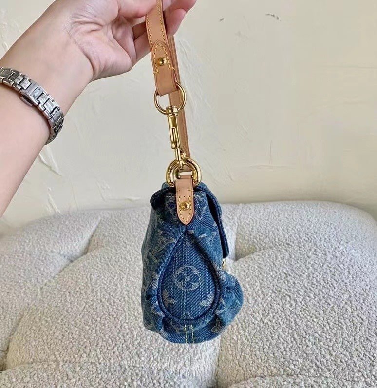 The Louis Vuitton Monogram Denim Pleaty bag. It is crafted from monogram denim in a blue shade with natural leather trim and gold-tone hardware. The bag features a flap with a push-lock closure and a single shoulder strap. This particular style, the Mini Pleaty, was produced in 2006.