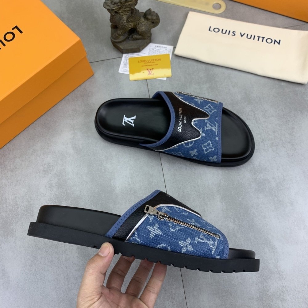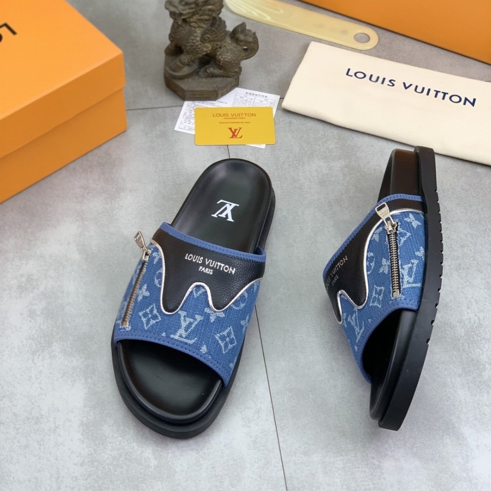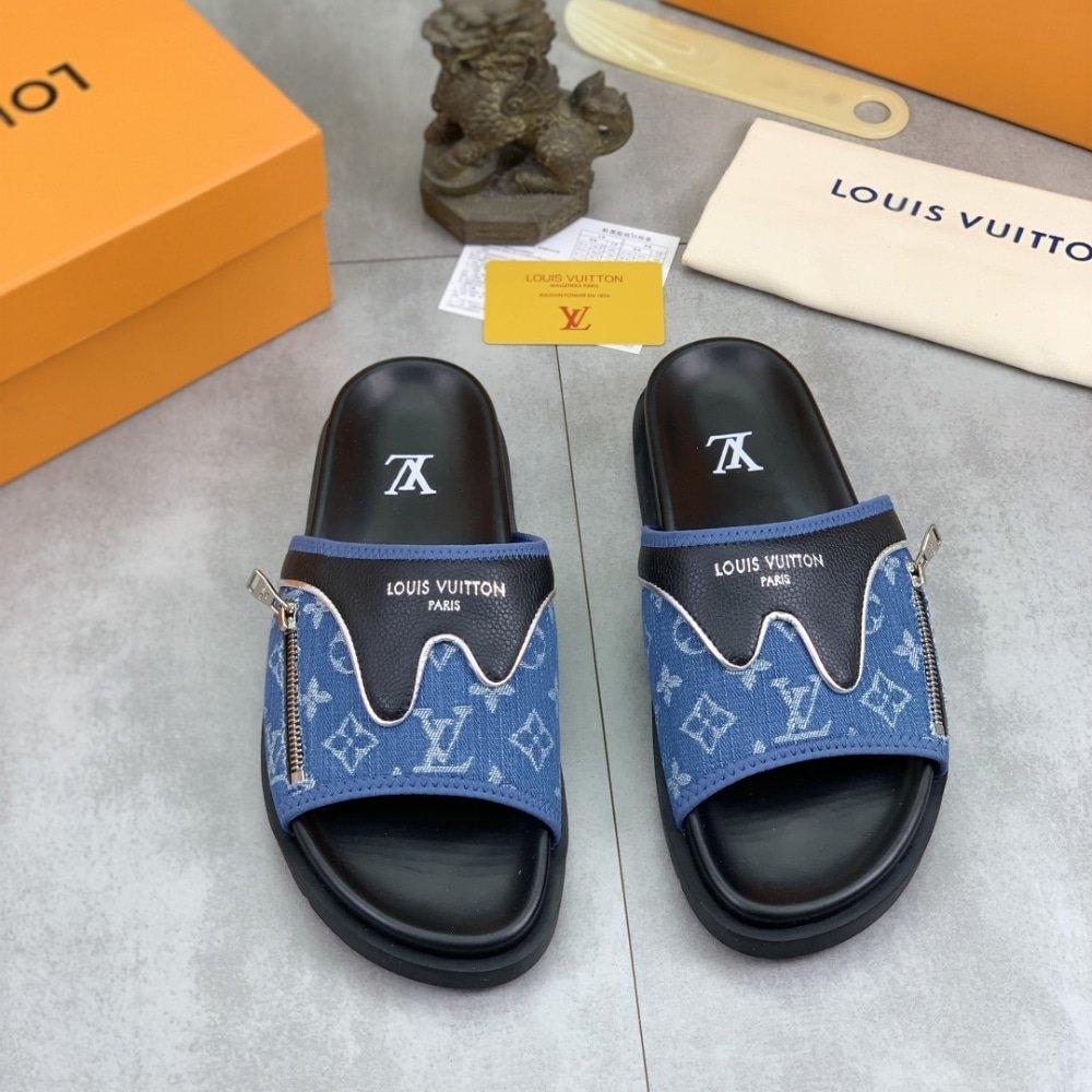 Louis Vuitton Velcro Slippers Lock Edge Denim Blue