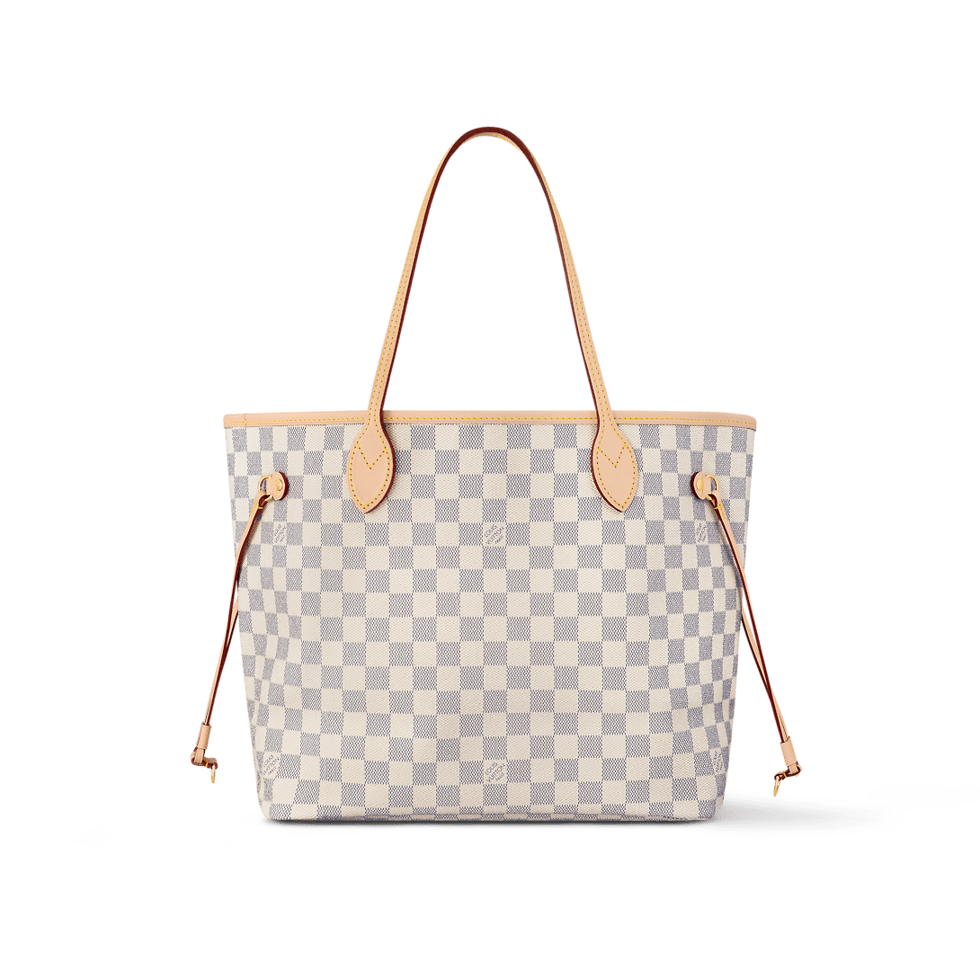 The Neverfull MM tote unites timeless design with heritage details. Made from fresh Damier Azur canvas with natural cowhide trim, it is roomy yet not bulky, with side laces that cinch for a sleek allure or loosen for a casual look. The slim leather handles slip easily over the shoulder or arm. Lined in colorful textile, it features a removable pouch which can be used as a clutch or an extra pocket.