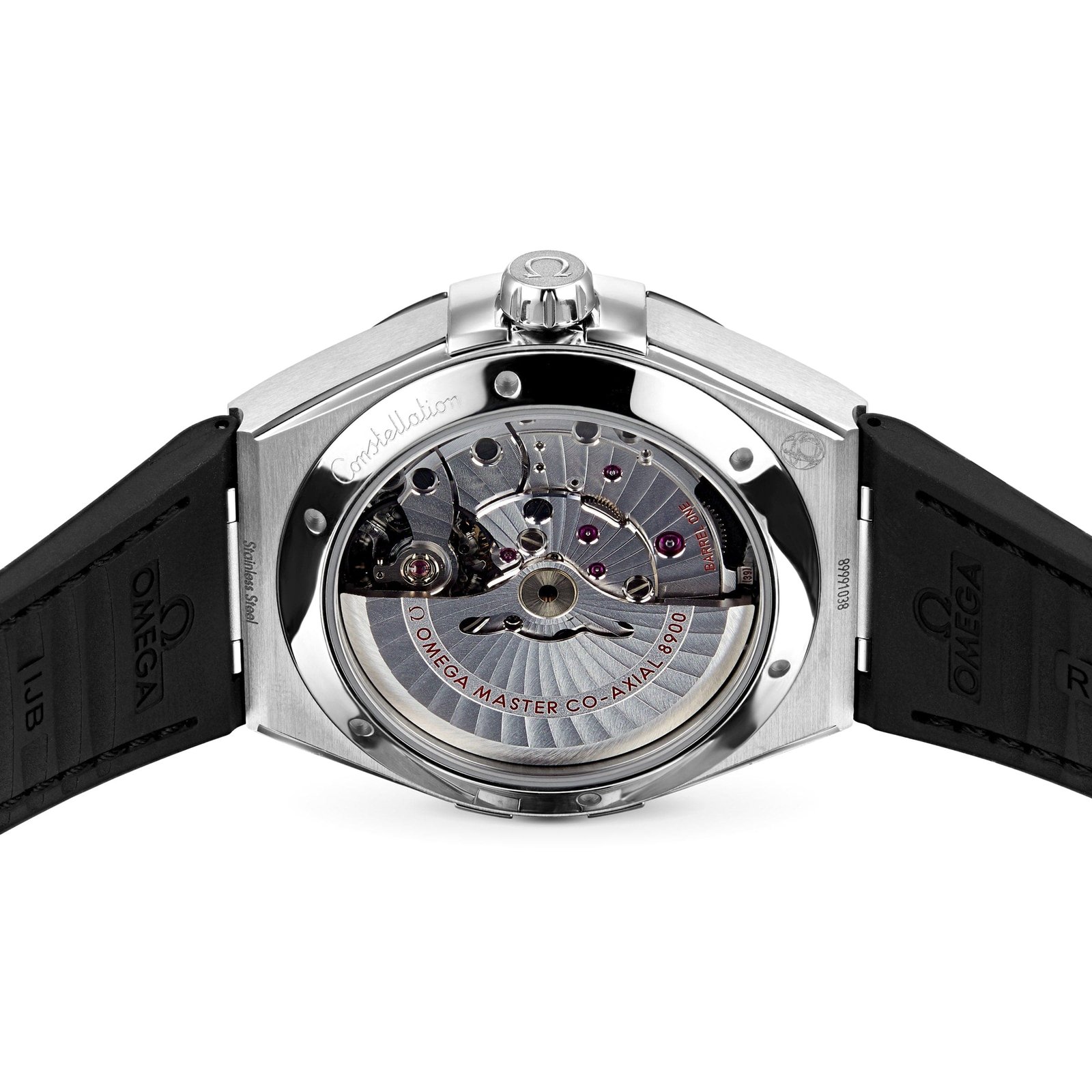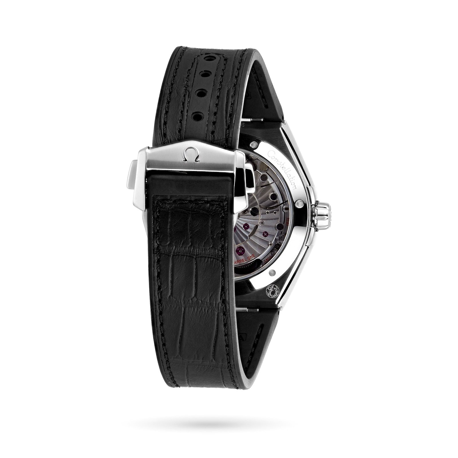 A tribute to Omega’s accomplishments in the 20th century Constellation heritage with the 8900 calibre movement 41mm stainless steel case paired with a black, rubber-lined leather strap Silk-embossed rhodium-grey dial framed by a polished, black ceramic Master chronometer certified by METAS A CELEBRATION OF PRECISION Launched in 1952, the iconic Constellation collection was created to pay tribute to Omega’s countless precision accomplishments during the early 20th century. Powered by the brand’s most advanced movements, the striking models in this collection are characterised by dramatic, enduring design. Each model features four claws on the side of the case, half-moon facets, Roman numerals, and a trapezoidal date window beneath a single star. ENDURING DESIGN This 41mm watch features a stainless case with a black, rubber-lined leather strap. The striking, silk-embossed rhodium-grey dial features blackened hands and hour markers, complimenting the polished black bezel. The 8900 calibre movement provides flawless precision and can be viewed through the transparent caseback.