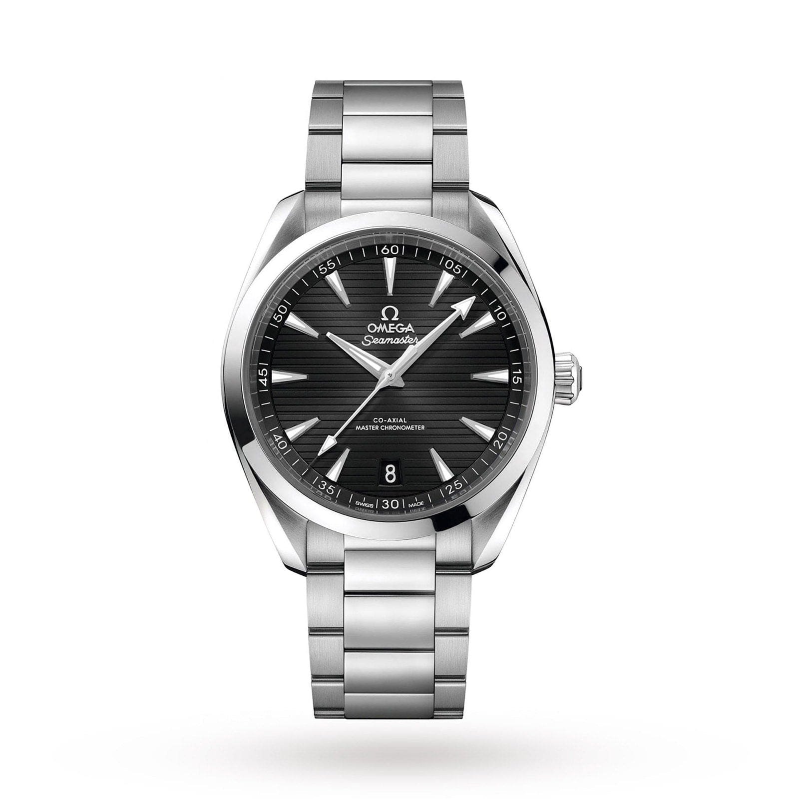 A tribute to Omega’s rich maritime heritage Seamaster heritage with 8900 calibre movement Water resistant to 15 bar (150 metres) 41mm stainless steel case paired with a stainless steel bracelet Master chronometer certified by METAS INSPIRED BY THE OCEAN A tribute to Omega’s rich maritime heritage, the Seamaster Aqua Terra collection balances technical sophistication and ocean spirit. The 150m models offer a refreshing new look, with clean aesthetics, a new symmetrical case design, and Master Chronometer movements with extraordinary levels of magnetic resistance. These timepieces are further characterised by a patterned dial, inspired by the wooden decks of luxury boats. TECHNICAL SOPHISTICATION This 41mm timepiece features a symmetrical, stainless steel case, paired with a co-ordinating stainless steel bracelet. The refined black dial features a date window at 6 o’clock, replicating the first Omega watch with a date window, released in 1952. The maritime influence can also be seen in the wave-edged design on the caseback. The 8900 calibre movement drives the watch with precision and power.