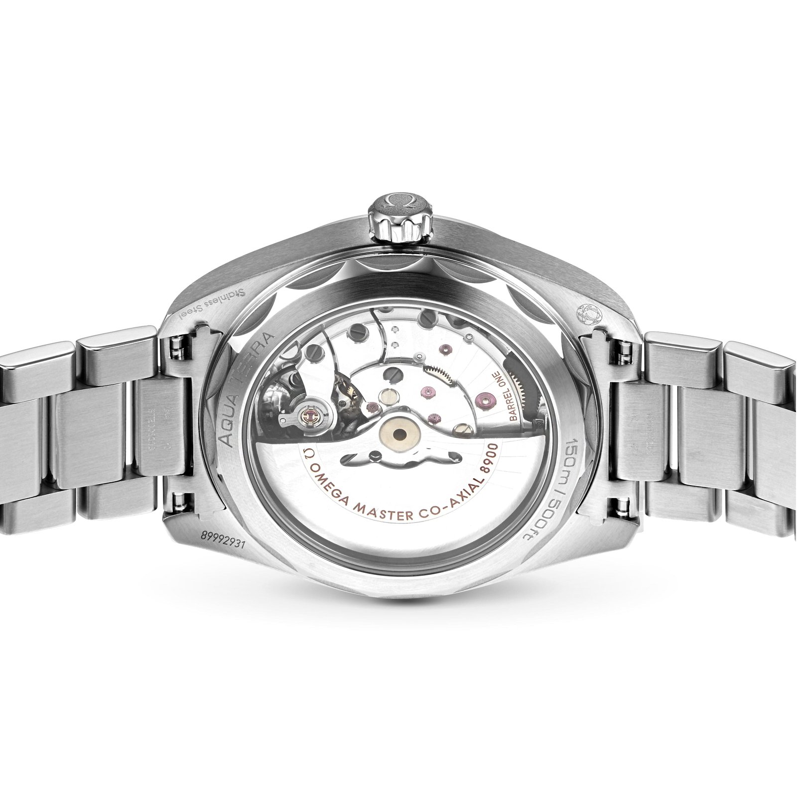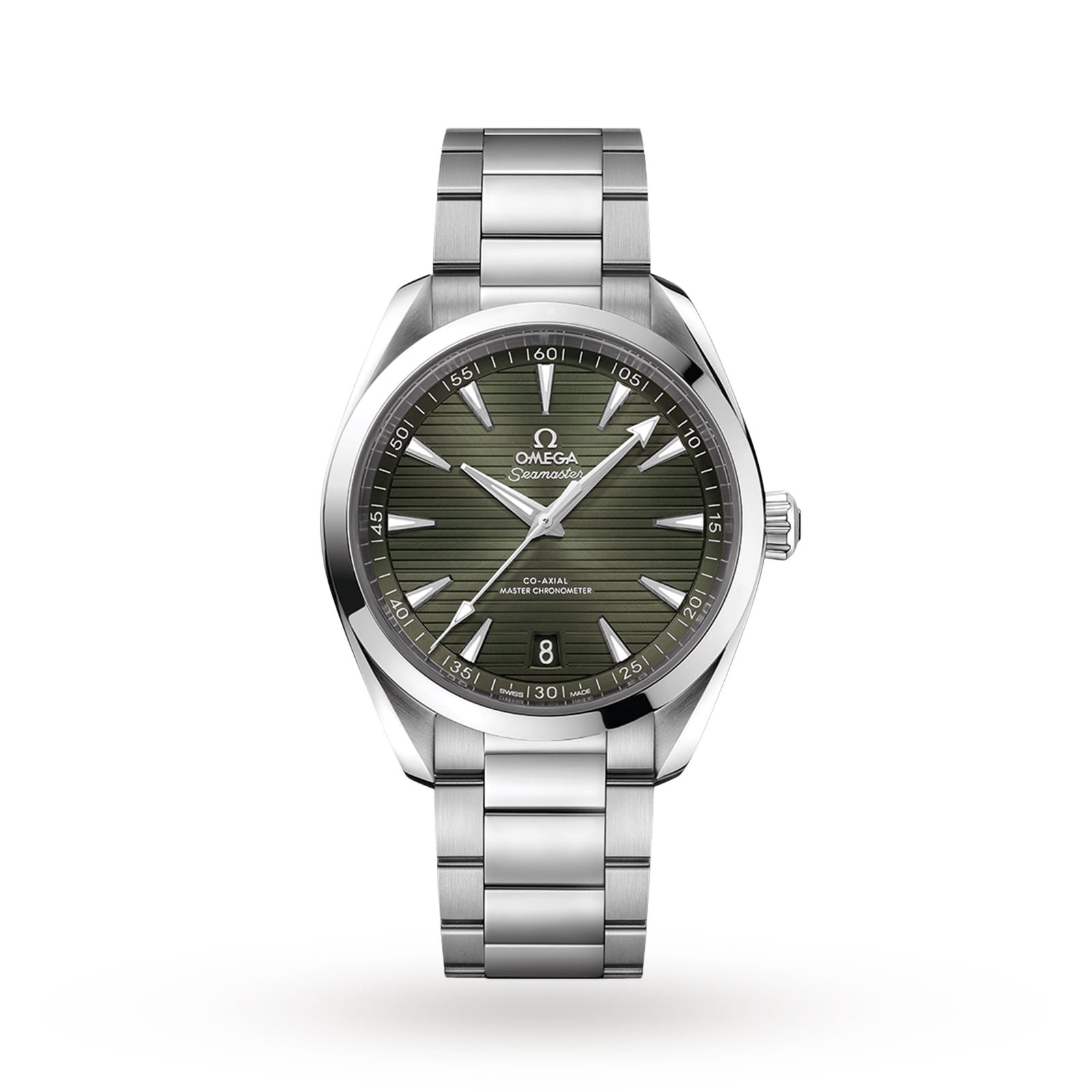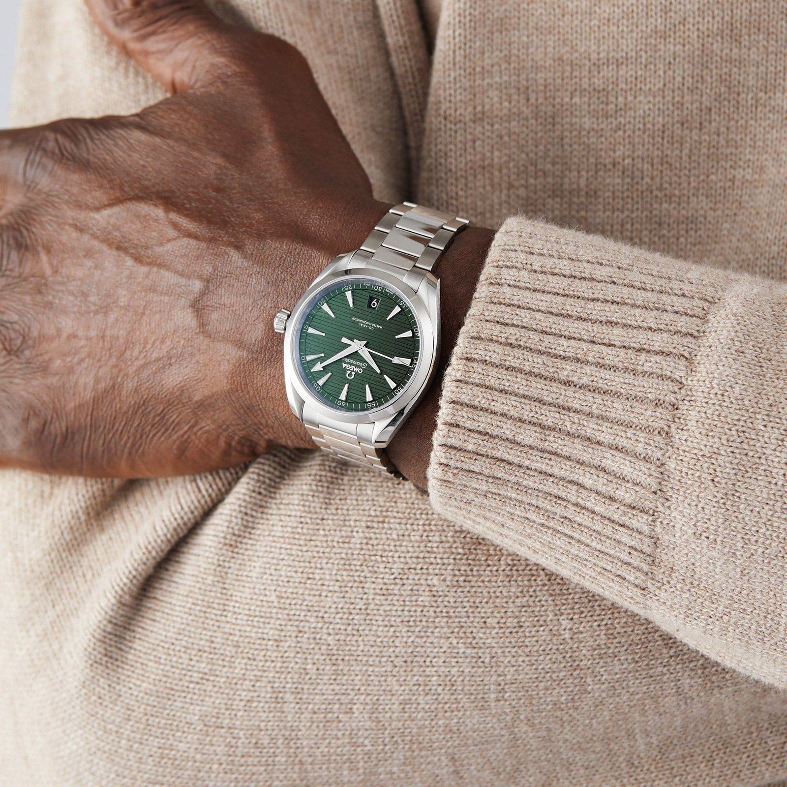 A tribute to Omega’s famous maritime legacy Seamaster heritage with the 8900 calibre movement Water resistant to 15 bar (150 metres) 41mm stainless steel case paired with a polished and brushed bracelet Master chronometer certified by METAS HONOURING OMEGA’S OCEAN HERITAGE Celebrating Omega’s rich maritime heritage, the iconic Seamaster Aqua Terra collection balances technical sophistication and ocean spirit. The updated 150m models offer an inspired new look, combining clean aesthetics, a new symmetrical case design, and Master Chronometer movements with extraordinary levels of magnetic resistance. These timepieces are further characterised by a patterned dial, inspired by the wooden decks of luxury boats. UNIQUE COLOURWAY This sleek 41mm watch features a symmetrical, stainless steel case, paired with a co-ordinating stainless steel bracelet. The striking sun-brushed green dial features a date window at 6 o’clock, and rhodium-plated hands and indexes filled with white Super-LumiNova for enhanced visibility. A further nod to the collection’s maritime heritage can also be seen in the wave-edged design on the caseback. The 8900 calibre movement provides flawless precision and magnetic field resistance to 15,000 gauss.