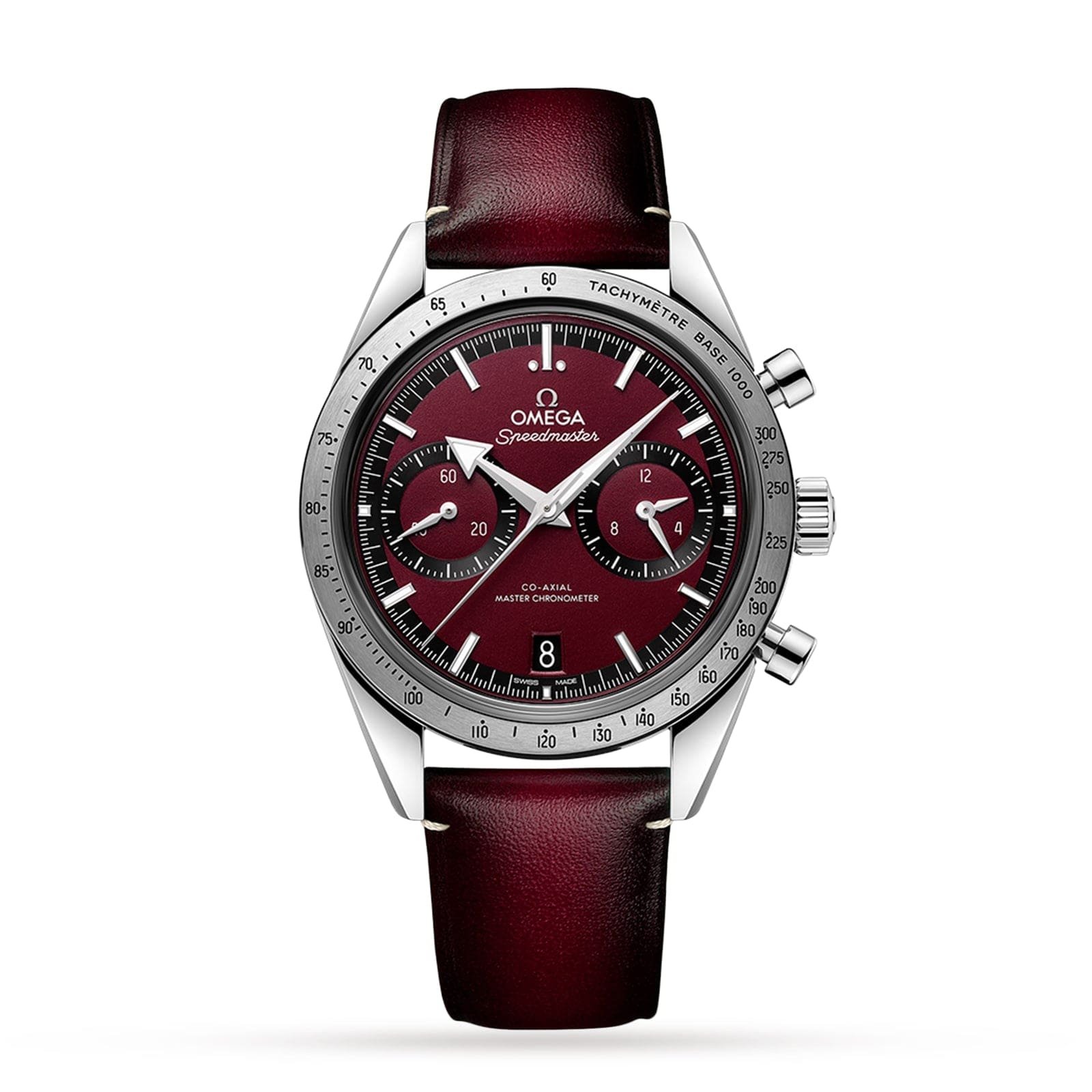 Inspired by the original Speedmaster design A Master Chronometer approved by METAS Includes tachymeter and chronograph features Driven by the 9906 calibre movement 40.5mm stainless steel case paired with a burgundy leather strap INSPIRED BY A LEGENDARY MODEL Launched in 1957, Omega’s Speedmaster collection has become truly legendary. Inspired by the iconic original model, the vintage- inspired ’57 models offer an aesthetic emulation of the classic design, with the addition of a slimmer profile and a Master Chronometer upgrade. A TIMELESS CLASSIC A 40.5mm model, this timepiece presents a burgundy dial with rhodium-plated indexes and hands filled with white Super-LumiNova for enhanced visibility. The dial is further enhanced with three sub-dials and small seconds in addition to being framed by a blackened tachymeter scale upon the bezel. A Master Chronometer certified by METAS, this Moonwatch is powered by the 9906 calibre movement and includes chronograph features for improved precision and reliability.