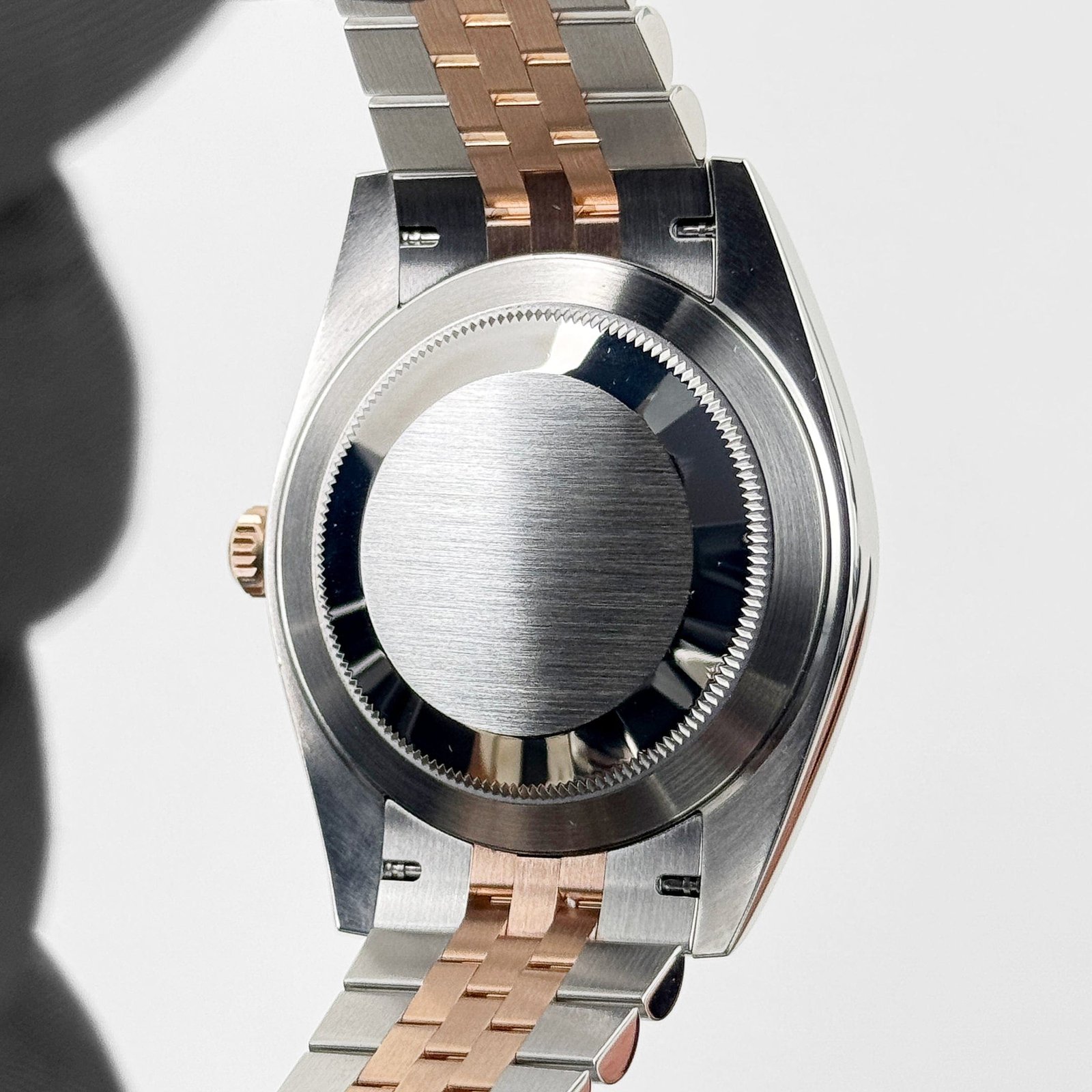 The Rolex 41 126331 merges rose gold and stainless steel in a refined two-tone execution. Its 41mm case is framed by a fluted rose gold bezel and secured with a Jubilee bracelet, striking a balance between dressy elegance and everyday wearability.