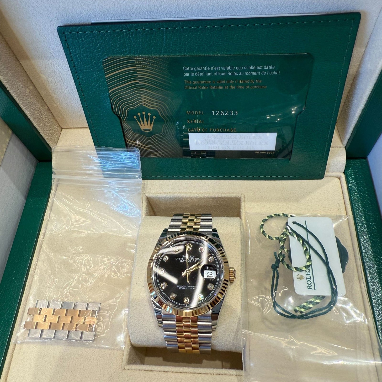 What truly elevates this model is its deep black dial, set with diamond hour markers framed in yellow gold. The combination of gold and diamond accents against the stark black background delivers a bold yet refined presence. With a date display at 3 o’clock magnified by the iconic Cyclops lens and a smooth automatic movement inside, the 126233 is a masterclass in understated luxury with everyday wearability.