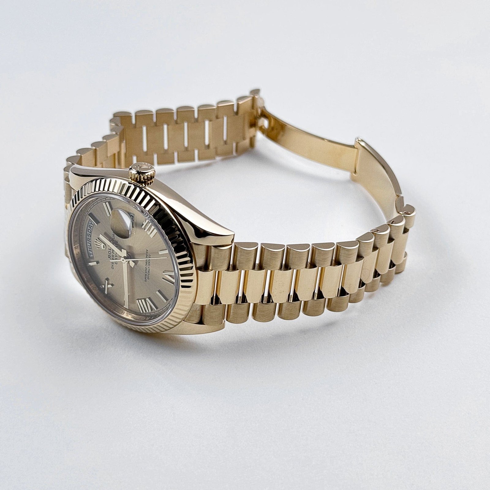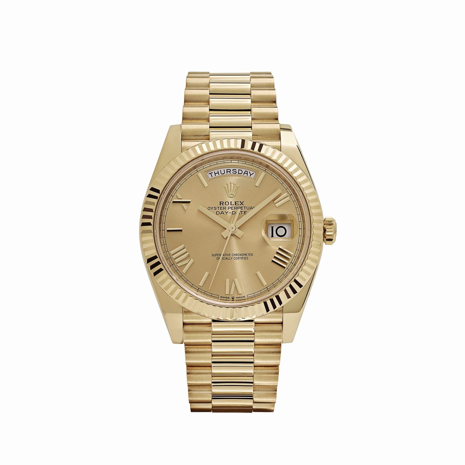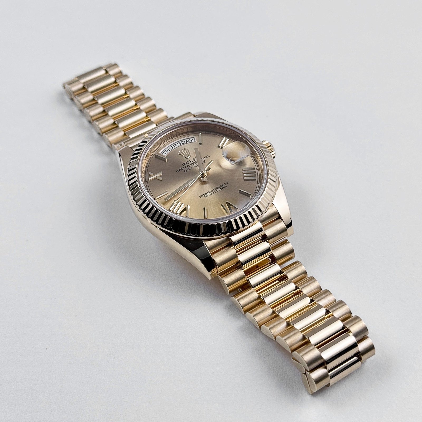 The champagne dial, adorned with bold Roman numeral hour markers and matching gold hands, enhances its classic appeal. The signature day display at 12 o’clock and the date window at 3 o’clock, magnified by the Cyclops lens, ensure practicality without compromising elegance.