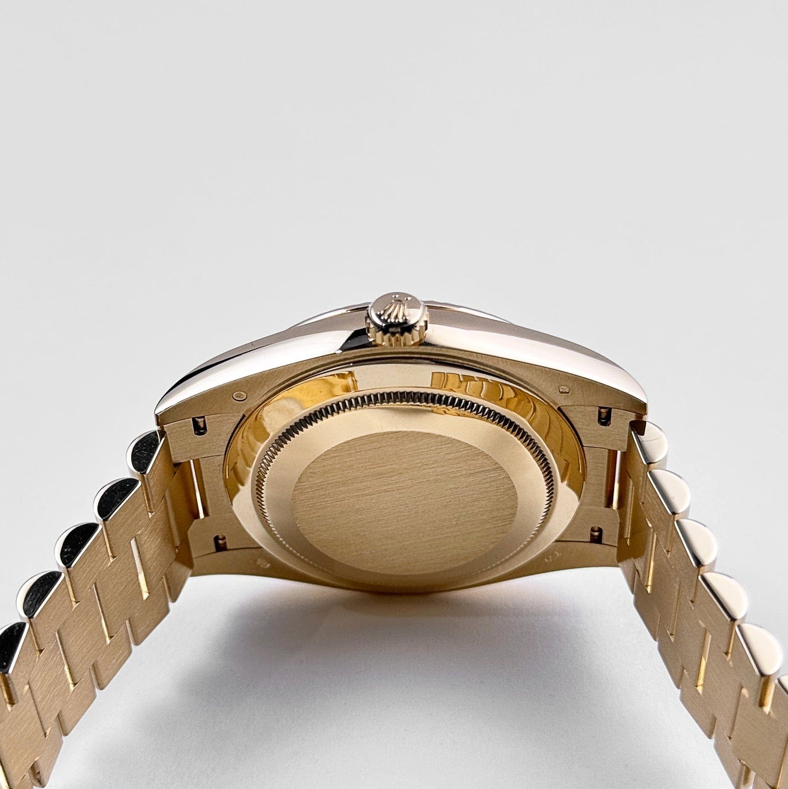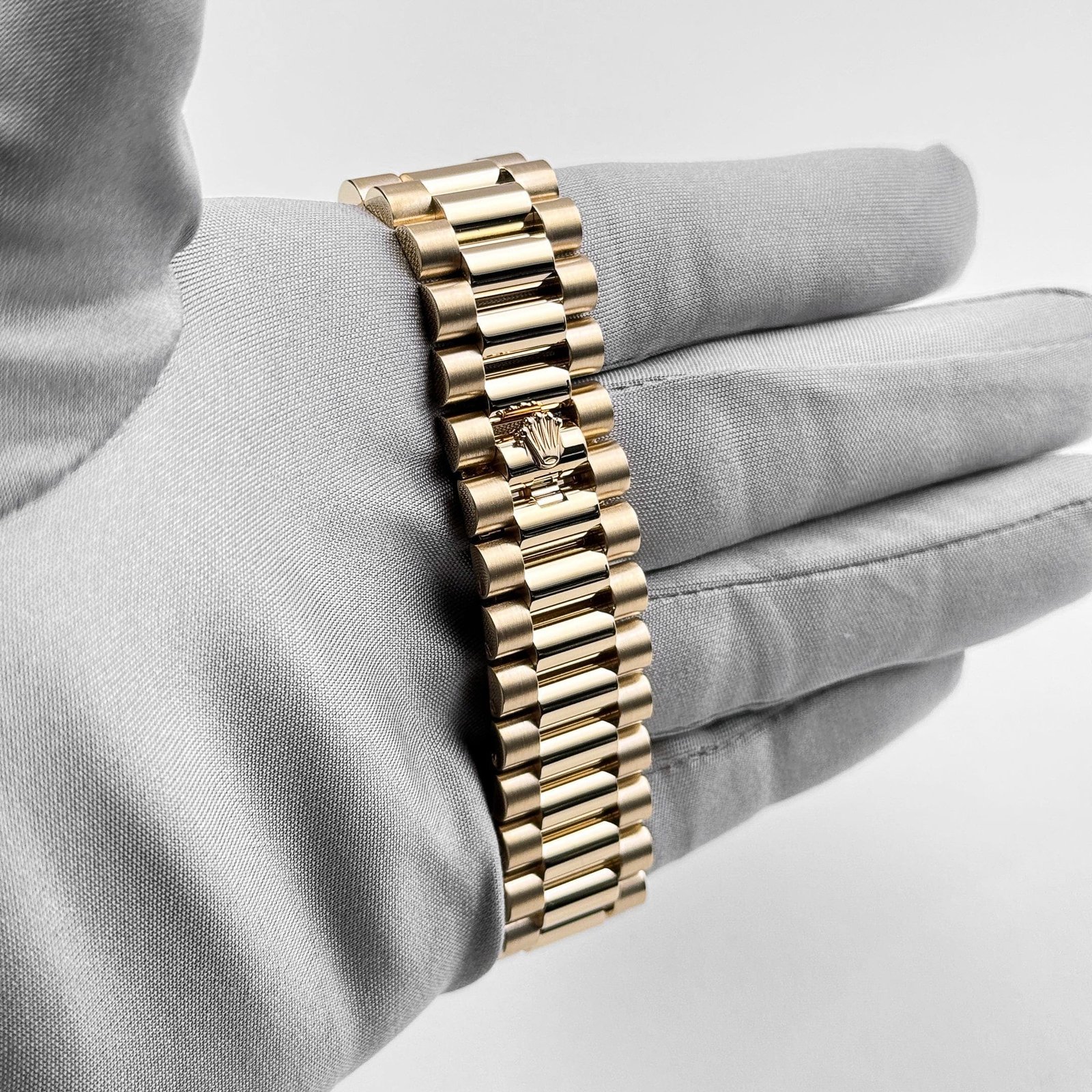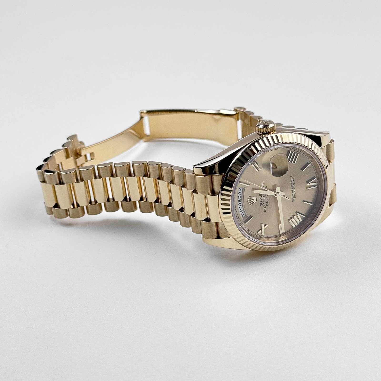 The champagne dial, adorned with bold Roman numeral hour markers and matching gold hands, enhances its classic appeal. The signature day display at 12 o’clock and the date window at 3 o’clock, magnified by the Cyclops lens, ensure practicality without compromising elegance.