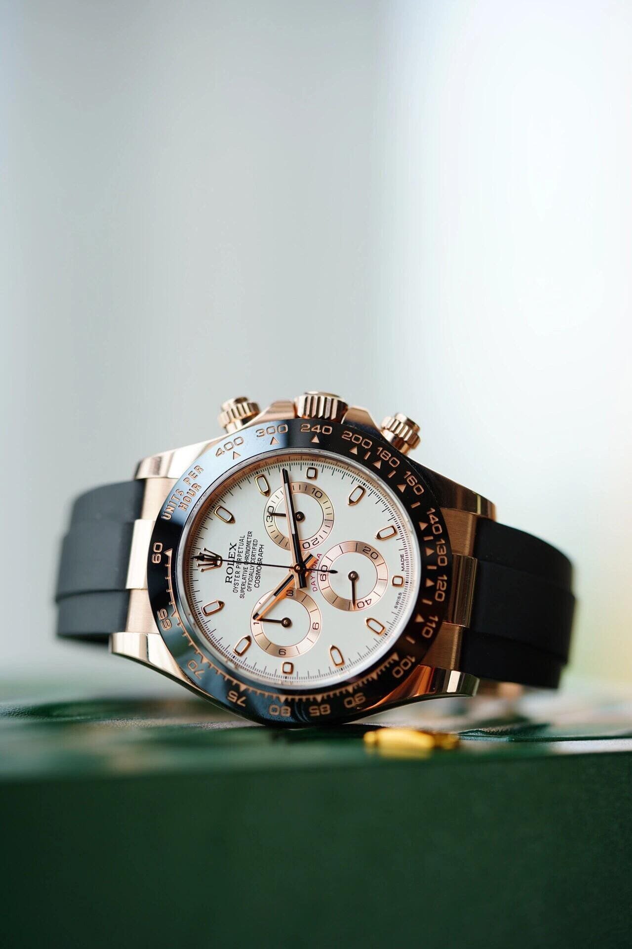 The ivory dial is elegantly accented with contrasting rose gold sub-dials, maintaining the Daytona’s signature chronograph layout. The Chromalight-filled hour markers and hands ensure readability in all lighting conditions. Completing the design is the sporty and comfortable black Oysterflex strap, combining the durability of elastomer with the refinement of a metal core.