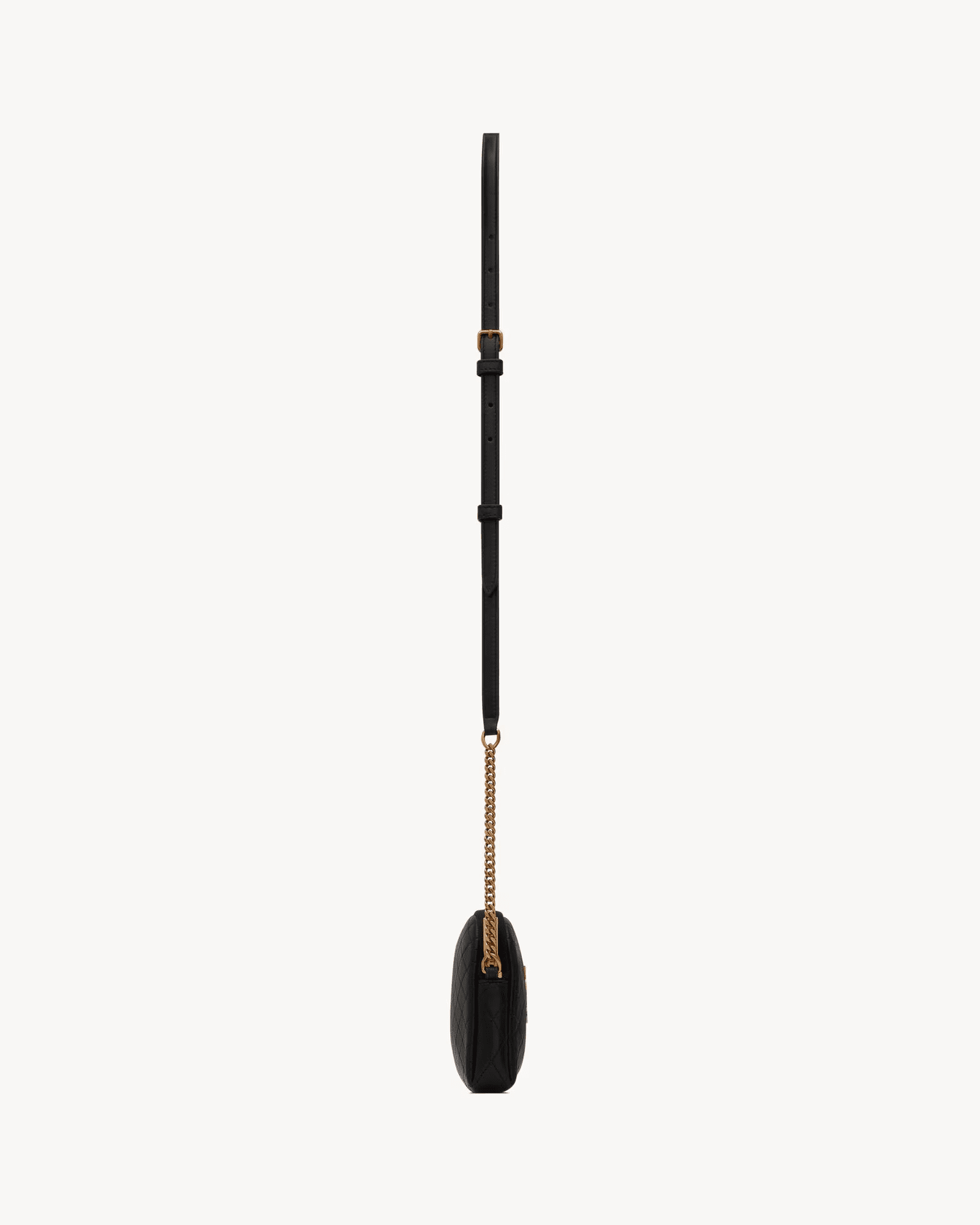 THIN AND LIGHT, IT FEATURES AN ADJUSTABLE CHAIN AND LEATHER STRAP FOR CARRYING ON THE SHOULDER OR ACROSS THE BODY