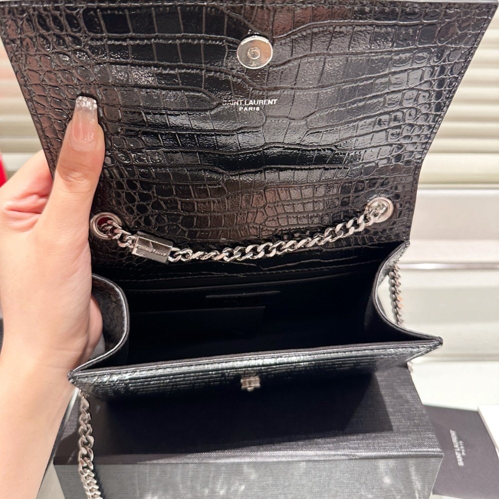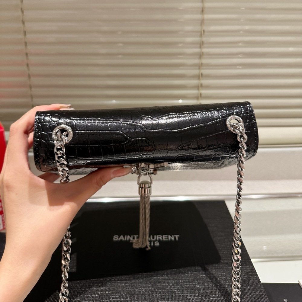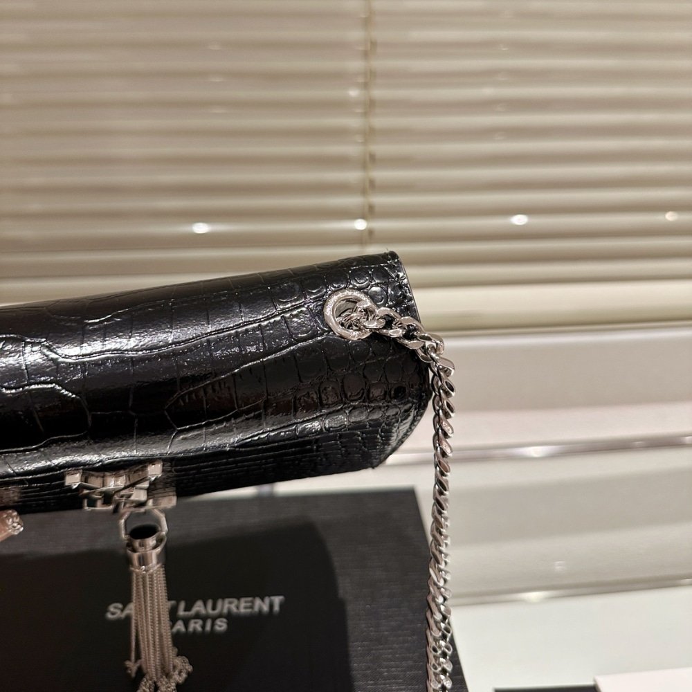 Saint Laurent Kate Small Tassel In Crocodile Embossed Leather Silver Black 19Cm 474366Dnd0N1000