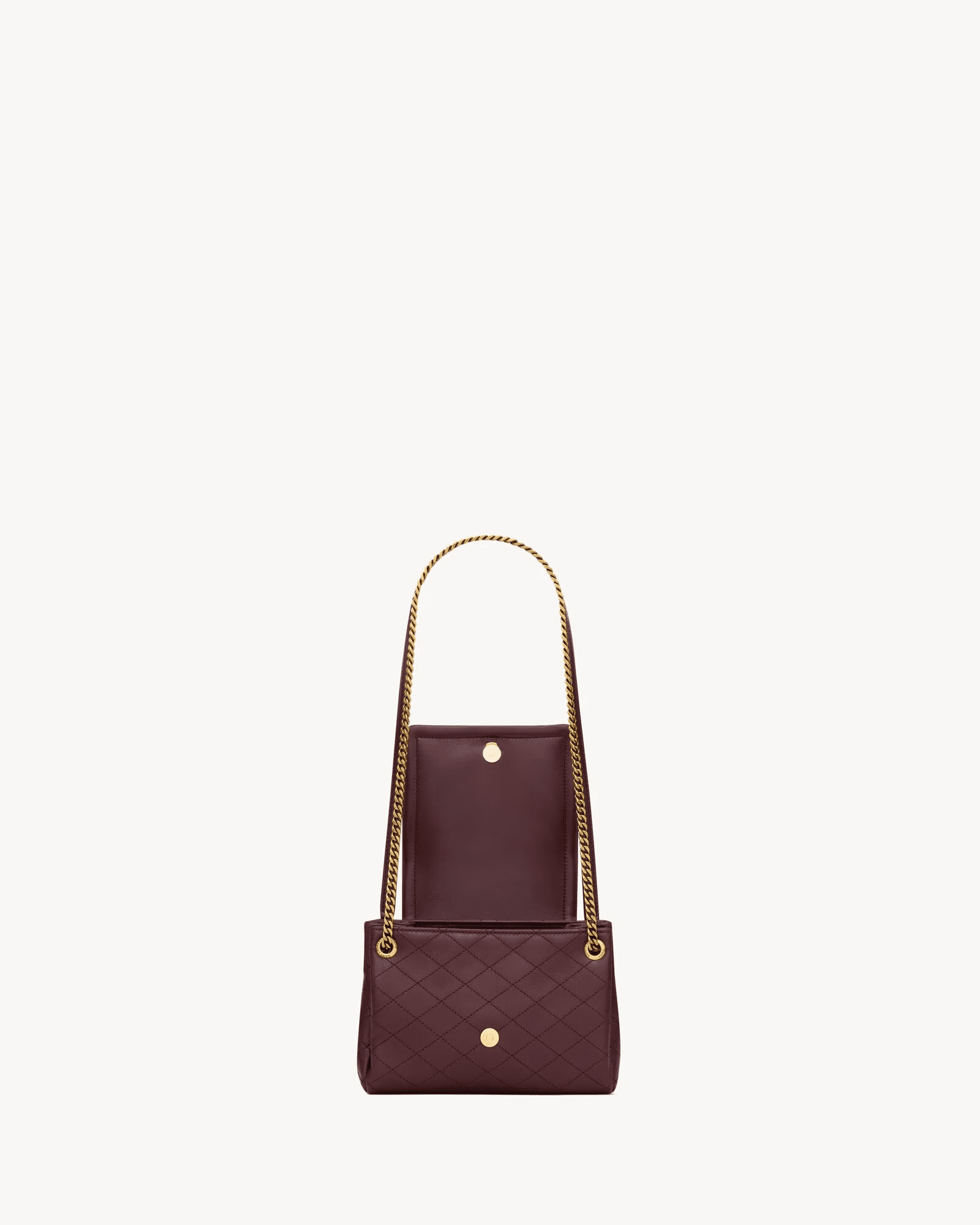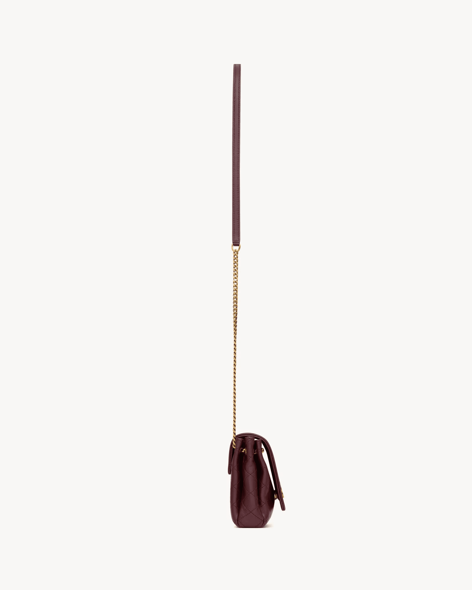A sliding leather and chain strap allows this soft bag to be carried on the shoulder or crossbody.