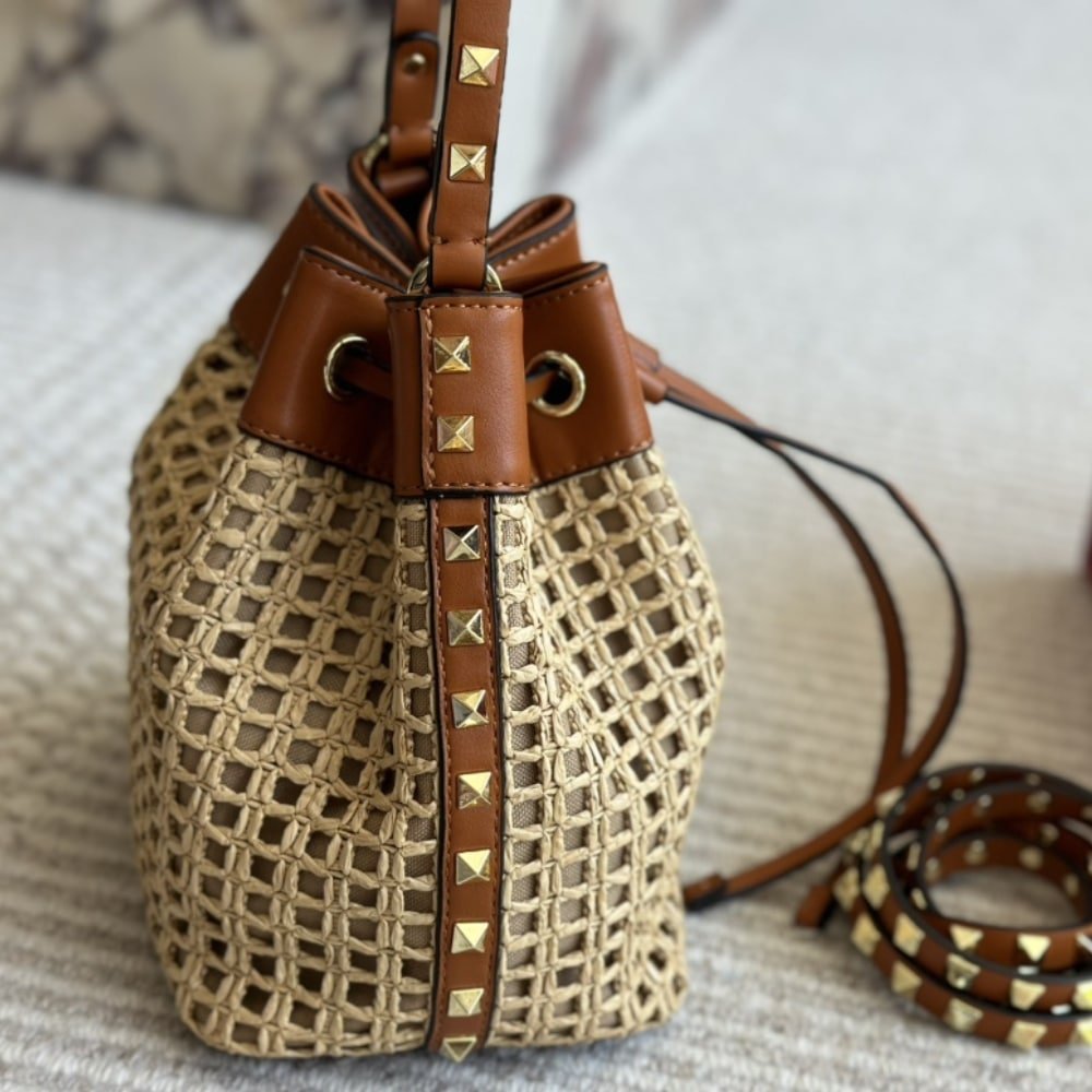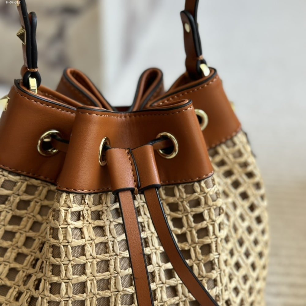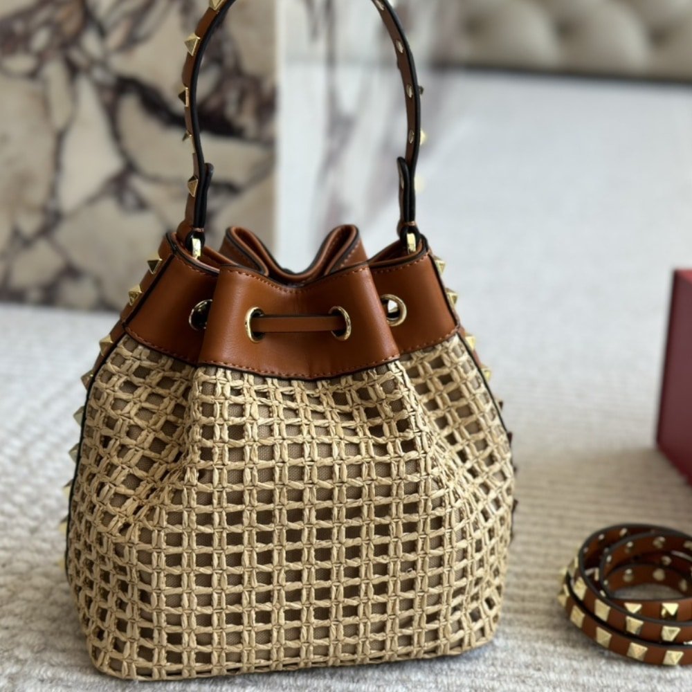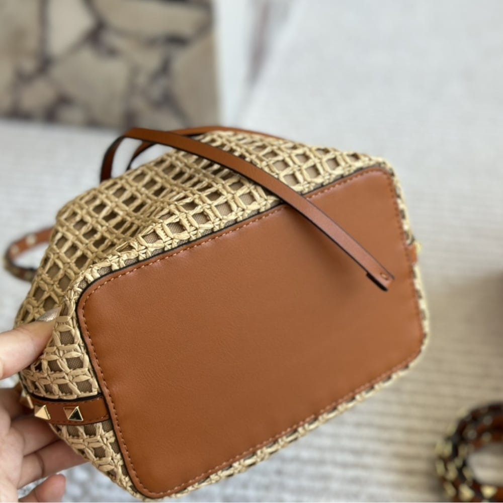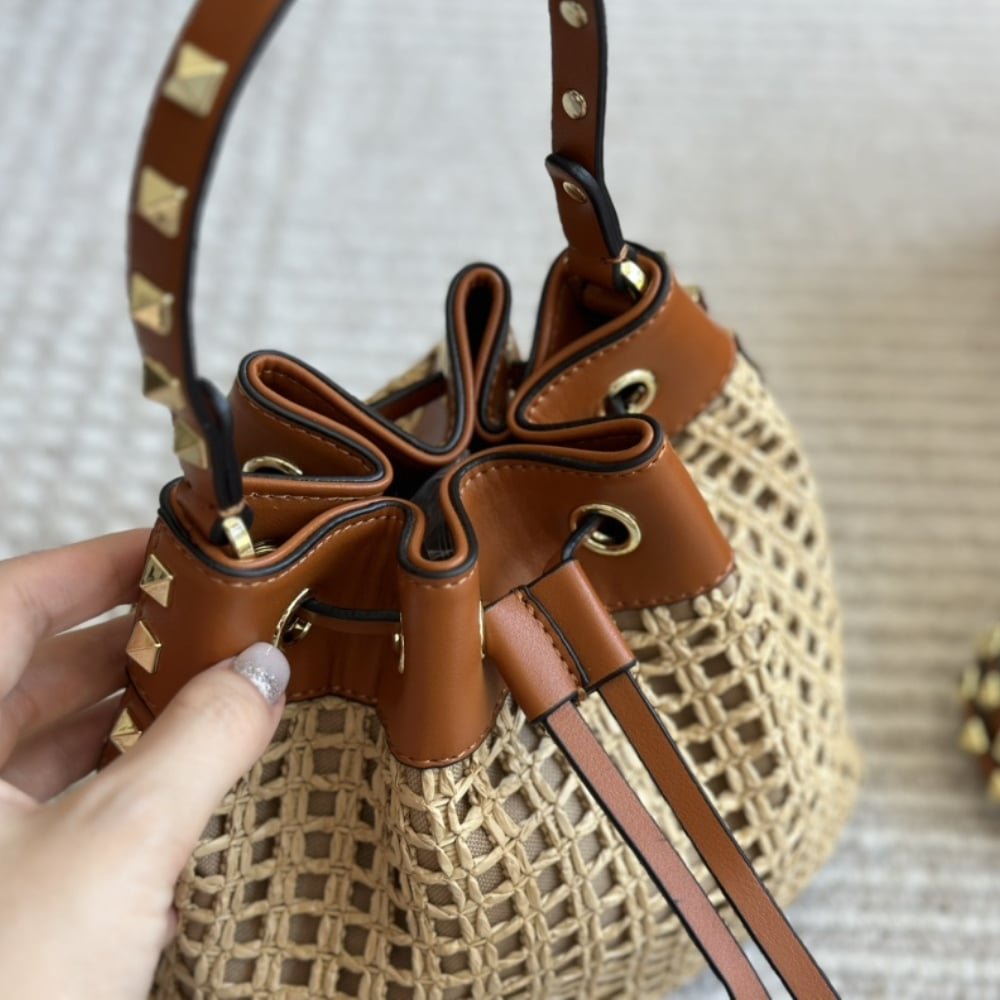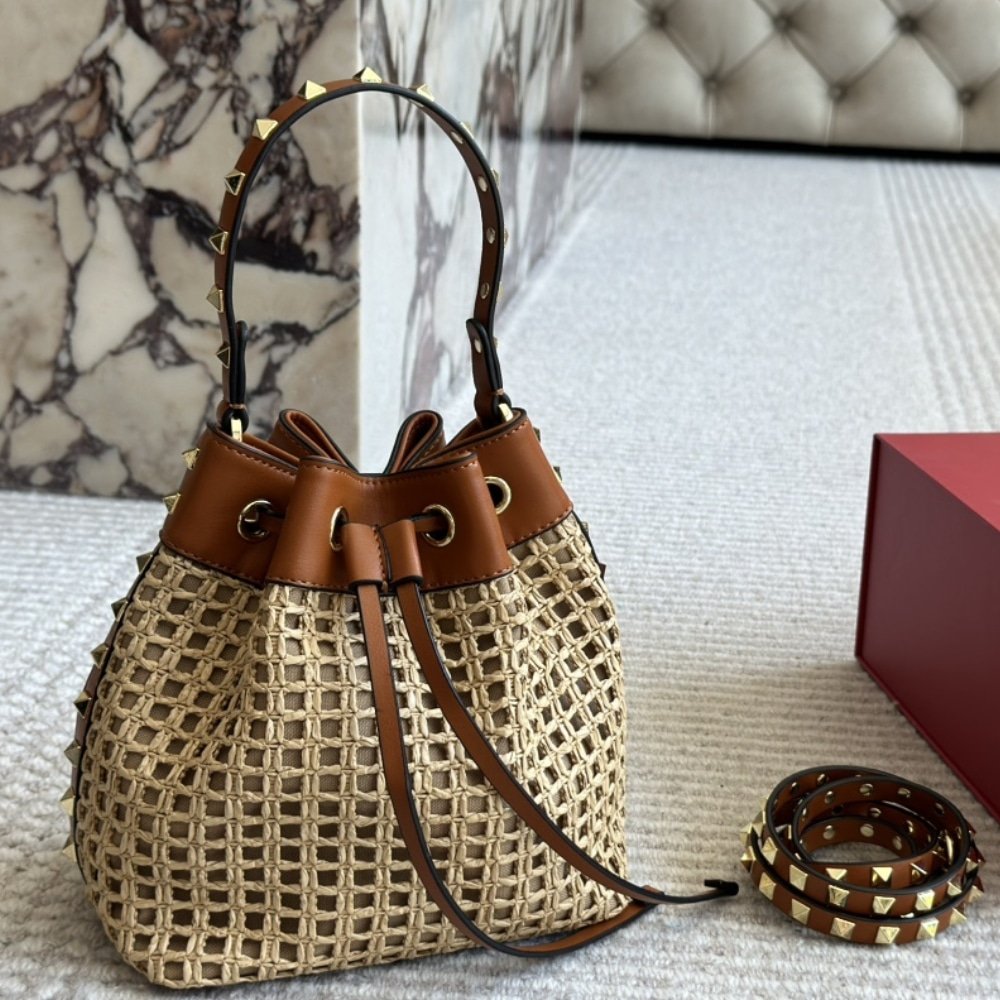 Valentino Rockstud Woven Bucket Bag Brown 19Cm